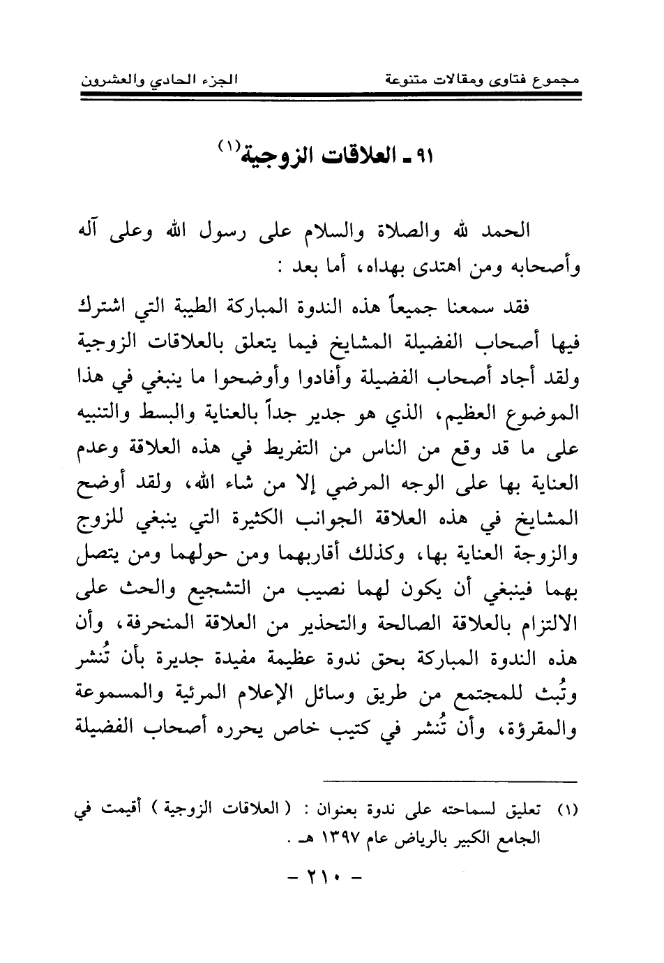 (¬1) تعليق لسماحته على ندوة بعنوان: (العلاقات الزوجية) أقيمت في الجامع الكبير بالرياض عام 1397هـ.