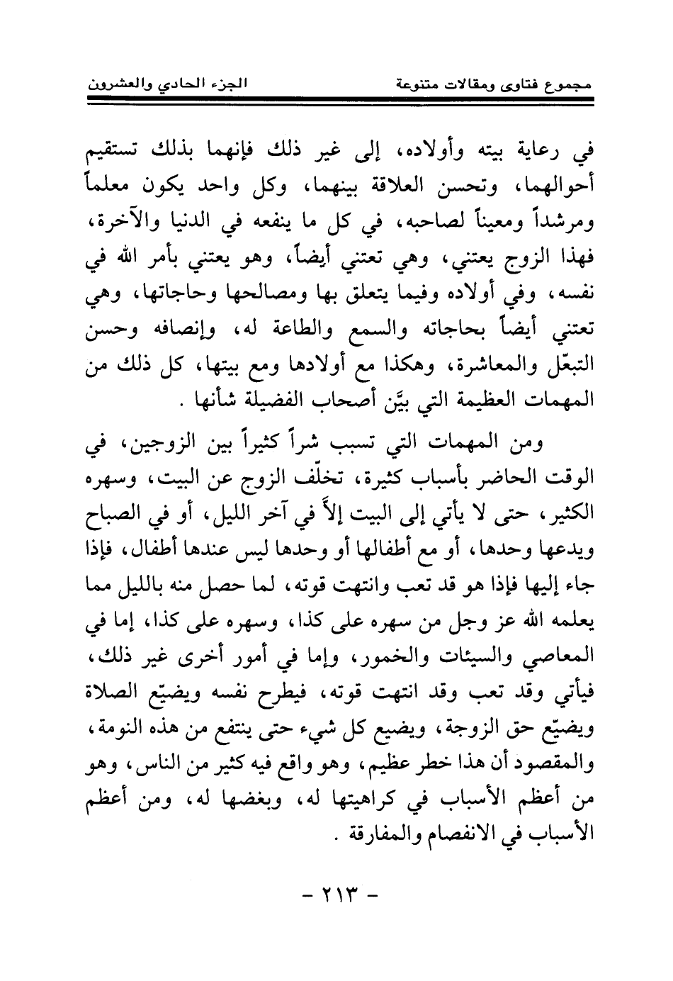 ومن المهمات التي تسبب شرا كثيرا بين الزوجين، في الوقت الحاضر بأسباب كثيرة، تخلف الزوج عن البيت، وسهره الكثير، حتى لا يأتي إلى البيت إلا في آخر الليل، أو في الصباح ويدعها وحدها، أو مع أطفالها، أو وحدها ليس عندها أطفال، فإذا جاء إليها فإذا هو قد تعب وانتهت قوته لما حصل منه بالليل مما يعلمه الله عز وجل من سهره على كذا، وسهره على كذا، إما في المعاصي والسيئات والخمور، وإما في أمور أخرى غير ذلك، فيأتي وقد تعب وقد انتهت قوته، فيطرح نفسه ويضيع الصلاة ويضيع حق الزوجة، ويضيع كل شيء حتى ينتفع من هذه النومة، والمقصود أن هذا خطر عظيم، وهو واقع فيه كثير من الناس، وهو من أعظم الأسباب في كراهيتها له وبغضها له، ومن أعظم الأسباب في الانفصام والمفارقة.
