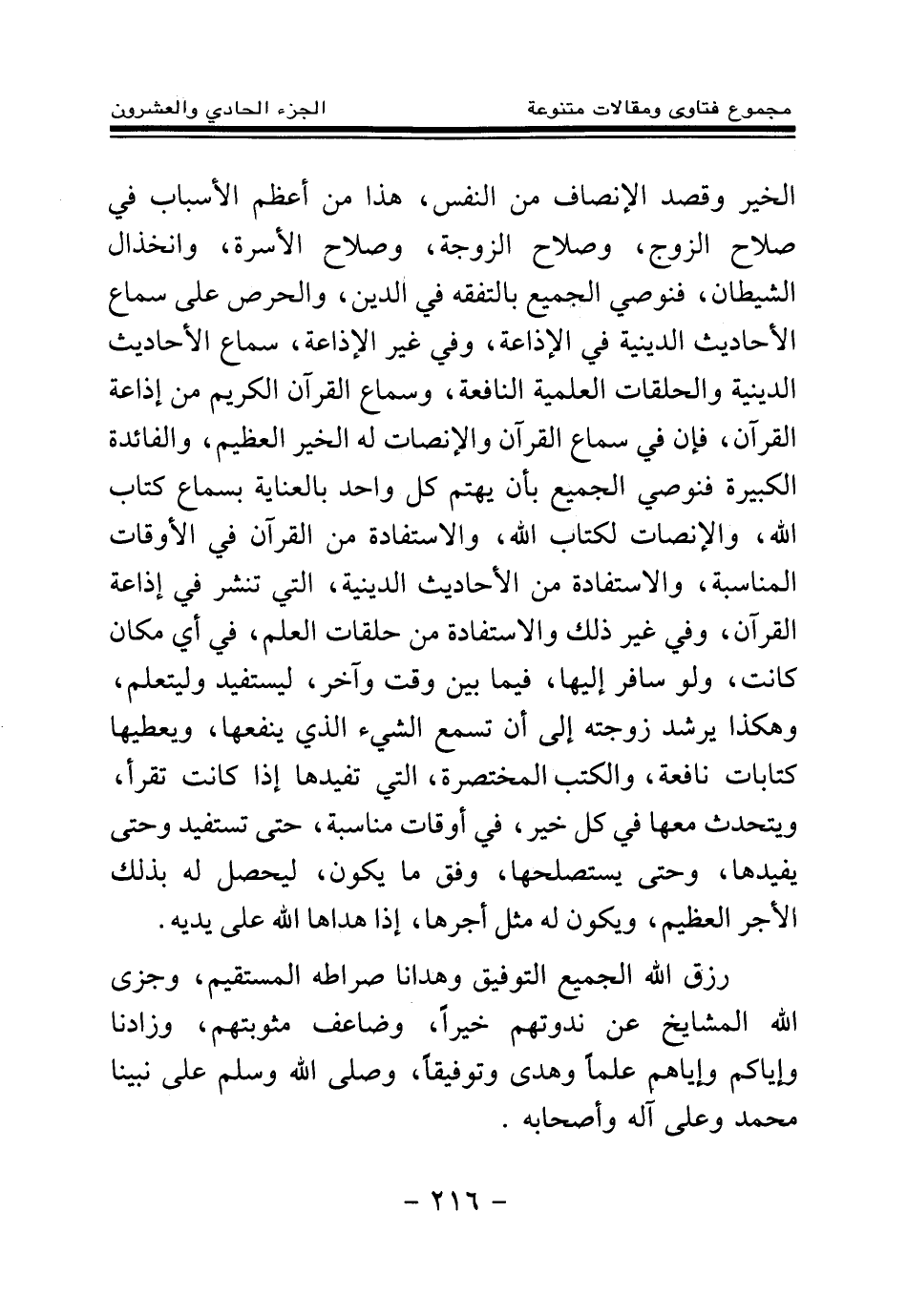 الخير وقصد الإنصاف من النفس، هذا من أعظم الأسباب في صلاح الزوج، وصلاح الزوجة، وصلاح الأسرة، وانخذال الشيطان، فنوصي الجميع بالتفقه في الدين، والحرص على سماع الأحاديث الدينية في الإذاعة، وفي غير الإذاعة، سماع الأحاديث الدينية والحلقات العلمية النافعة، وسماع القرآن الكريم من إذاعة القرآن، فإن في سماع القرآن والإنصات له الخير العظيم، والفائدة الكبيرة؛ فنوصي الجميع بأن يهتم كل واحد بالعناية بسماع كتاب الله، والإنصات لكتاب الله، والاستفادة من القرآن في الأوقات المناسبة، والاستفادة من الأحاديث الدينية التي تنشر في إذاعة القرآن، وفي غير ذلك، والاستفادة من حلقات العلم، في أي مكان كانت، ولو سافر إليها فيما بين وقت وآخر، ليستفيد وليتعلم، وهكذا يرشد زوجته إلى أن تسمع الشيء الذي ينفعها، ويعطيها كتابات نافعة، والكتب المختصرة التي تفيدها إذا كانت تقرأ، ويتحدث معها في كل خير في أوقات مناسبة، حتى تستفيد وحتى يفيدها، وحتى يستصلحها، وفق ما يكون، ليحصل له بذلك الأجر العظيم، ويكون له مثل أجرها، إذا هداها الله على يديه.