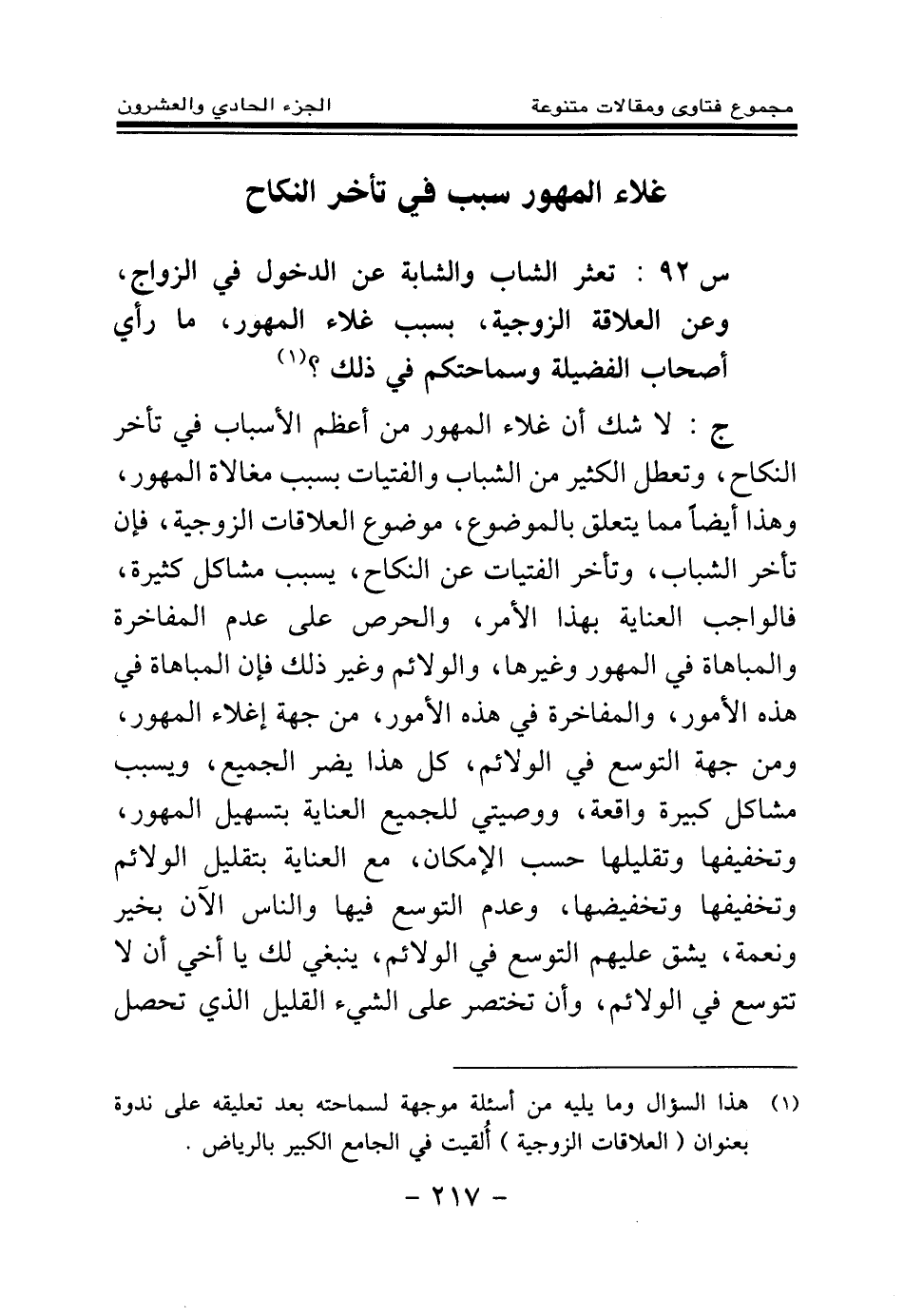 ج: لا شك أن غلاء المهور من أعظم الأسباب في تأخر النكاح، وتعطل الكثير من الشباب والفتيات بسبب مغالاة المهور، وهذا أيضا مما يتعلق بالموضوع، موضوع العلاقات الزوجية، فإن تأخر الشباب وتأخر الفتيات عن النكاح يسبب مشاكل كثيرة، فالواجب العناية بهذا الأمر، والحرص على عدم المفاخرة والمباهاة في المهور وغيرها، والولائم وغير ذلك؛ فإن المباهاة في هذه الأمور والمفاخرة في هذه الأمور من جهة إغلاء المهور، ومن جهة التوسع في الولائم، كل هذا يضر الجميع، ويسبب مشاكل كبيرة واقعة، ووصيتي للجميع العناية بتسهيل المهور، وتخفيفها وتقليلها حسب الإمكان، مع العناية بتقليل الولائم وتخفيفها وتخفيضها، وعدم التوسع فيها، والناس الآن بخير ونعمة، يشق عليهم التوسع في الولائم، ينبغي لك يا أخي أن لا تتوسع في الولائم، وأن تختصر على الشيء القليل الذي تحصل