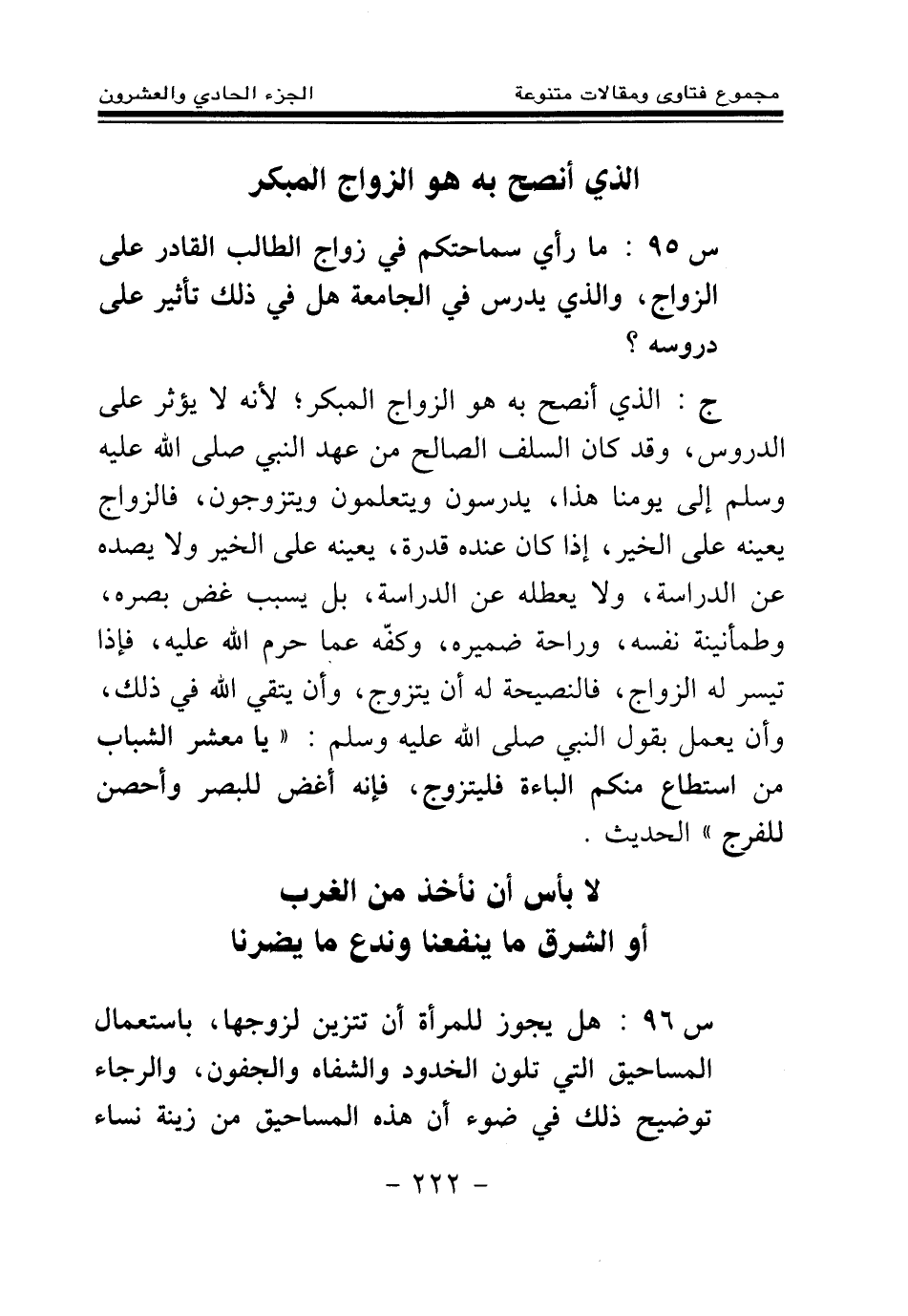 ج: الذي أنصح به هو الزواج المبكر؛ لأنه لا يؤثر على الدروس، وقد كان السلف الصالح من عهد النبي - صلى الله عليه وسلم - إلى يومنا هذا، يدرسون ويتعلمون ويتزوجون، فالزواج يعينه على الخير، إذا كان عنده قدرة، يعينه على الخير ولا يصده عن الدراسة، ولا يعطله عن الدراسة، بل يسبب غض بصره، وطمأنينة نفسه، وراحة ضميره، وكفه عما حرم الله عليه، فإذا تيسر له الزواج، فالنصيحة له أن يتزوج، وأن يتقي الله في ذلك، وأن يعمل بقول النبي - صلى الله عليه وسلم -: «يا معشر الشباب، من استطاع منكم الباءة فليتزوج، فإنه أغض للبصر وأحصن للفرج (¬1) » الحديث.