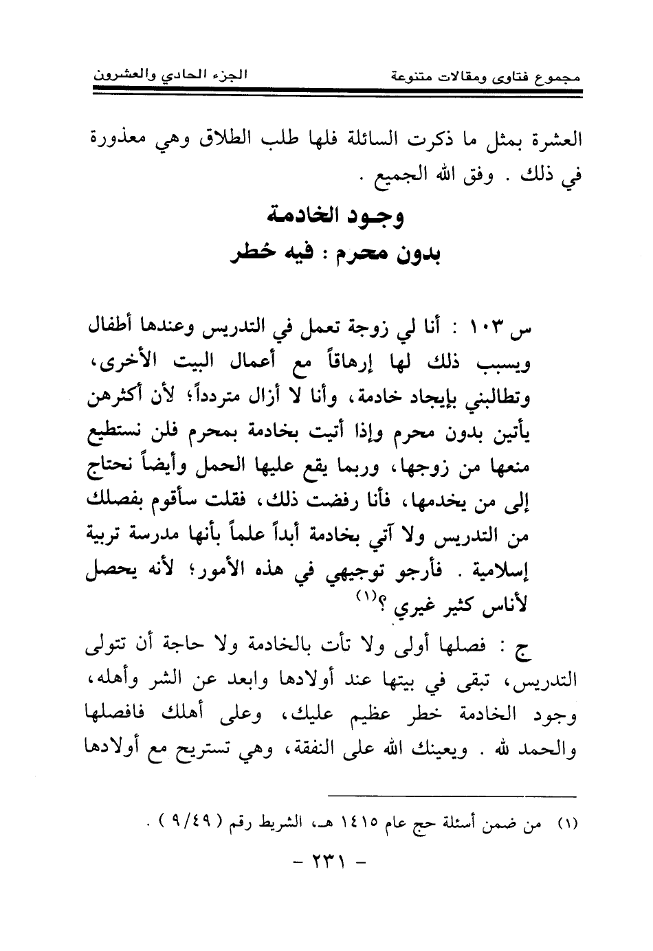 س 103: أنا لي زوجة تعمل في التدريس وعندها أطفال ويسبب ذلك لها إرهاقا مع أعمال البيت الأخرى، وتطالبني بإيجاد خادمة، وأنا لا أزال مترددا؛ لأن أكثرهن يأتين بدون محرم، وإذا أتيت بخادمة بمحرم فلن نستطيع منعها من زوجها، وربما يقع عليها الحمل، وأيضا نحتاج إلى من يخدمها، فأنا رفضت ذلك، فقلت: سأقوم بفصلك من التدريس ولا آتي بخادمة أبدا، علما بأنها مدرسة تربية إسلامية. فأرجو توجيهي في هذه الأمور؛ لأنه سيحصل لأناس كثير غيري؟ (¬1)