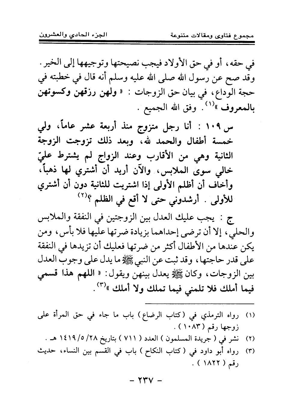 س 109: أنا رجل متزوج منذ أربعة عشر عاما، ولي خمسة أطفال والحمد لله، وبعد ذلك تزوجت الزوجة الثانية وهي من الأقارب، وعند الزواج لم يشترط علي خالي سوى الملابس، والآن أريد أن أشتري لها ذهبا، وأخاف أن أظلم الأولى إذا اشتريت للثانية دون أن أشتري للأولى. أرشدوني حتى لا أقع في الظلم؟ (¬1) . ج: يجب عليك العدل بين الزوجتين في النفقة والملابس والحلي، إلا أن ترضى إحداهما بزيادة ضرتها عليها فلا بأس، ومن يكن عندها من الأطفال أكثر من ضرتها فعليك أن تزيدها في النفقة على قدر حاجتها، وقد ثبت عن النبي - صلى الله عليه وسلم - ما يدل على وجوب العدل بين الزوجات، وكان - صلى الله عليه وسلم - يعدل بينهن ويقول: «اللهم هذا قسمي فيما أملك، فلا تلمني فيما تملك ولا أملك (¬2) » .