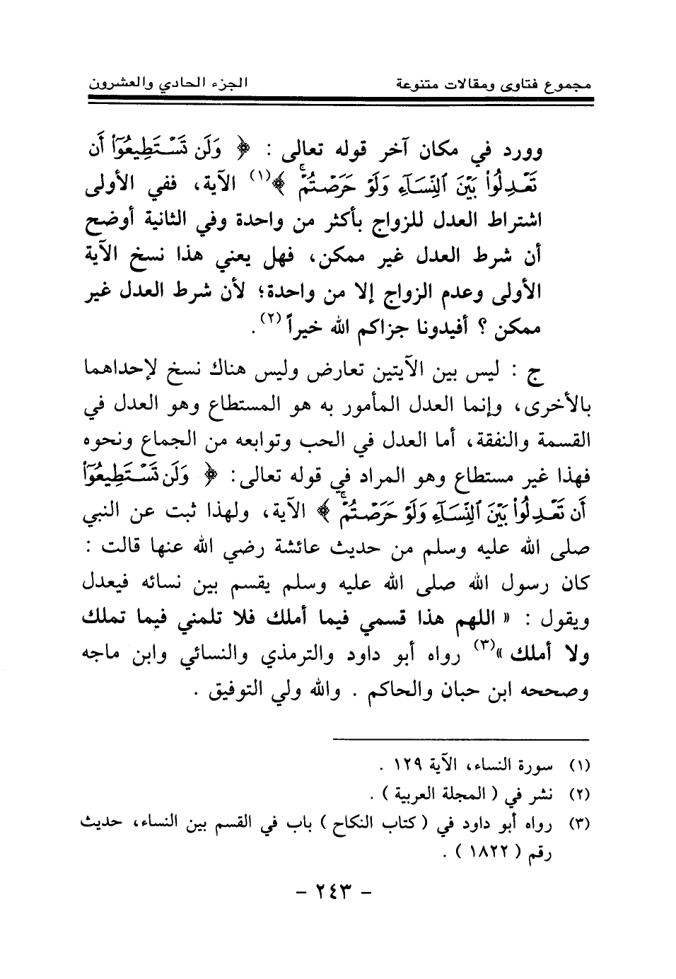 (¬4) رواه أبو داود في (كتاب النكاح) باب في القسم بين النساء، حديث رقم (1822) .