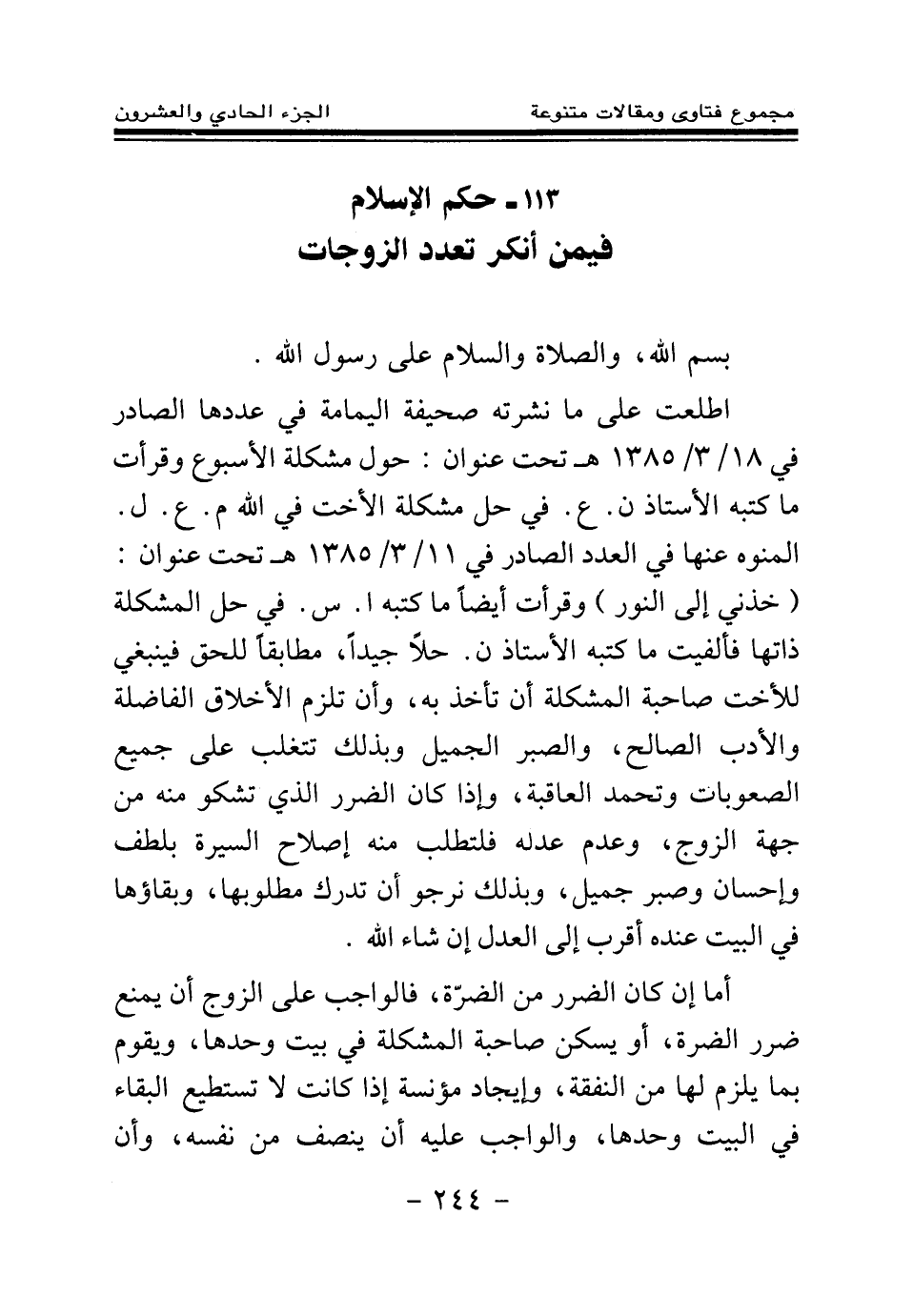 بسم الله، والصلاة والسلام على رسول الله. اطلعت على ما نشرته صحيفة اليمامة في عددها الصادر في 18\3\1385هـ تحت عنوان: حول مشكلة الأسبوع، وقرأت ما كتبه الأستاذ ن. ع. في حل مشكلة الأخت في الله م. ع. ل. المنوه عنها في العدد الصادر في 11\3\1385هـ تحت عنوان: (خذني إلى النور) وقرأت أيضا ما كتبه أ. س. في حل المشكلة ذاتها، فألفيت ما كتبه الأستاذ ن. حلا جيدا، مطابقا للحق؛ فينبغي للأخت صاحبة المشكلة أن تأخذ به، وأن تلزم الأخلاق الفاضلة والأدب الصالح، والصبر الجميل، وبذلك تتغلب على جميع الصعوبات وتحمد العاقبة، وإذا كان الضرر الذي تشكو منه من جهة الزوج، وعدم عدله فلتطلب منه إصلاح السيرة بلطف وإحسان وصبر جميل، وبذلك نرجو أن تدرك مطلوبها، وبقاؤها في البيت عنده أقرب إلى العدل إن شاء الله. أما إن كان الضرر من الضرة، فالواجب على الزوج أن يمنع ضرر الضرة، أو يسكن صاحبة المشكلة في بيت وحدها، ويقوم بما يلزم لها من النفقة، وإيجاد مؤنسة إذا كانت لا تستطيع البقاء في البيت وحدها، والواجب عليه أن ينصف من نفسه، وأن
