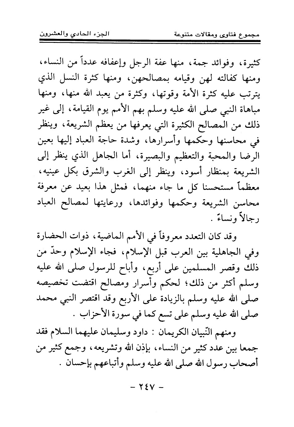 كثيرة، وفوائد جمة، منها عفة الرجل وإعفافه عددا من النساء، ومنها كفالته لهن وقيامه بمصالحهن، ومنها كثرة النسل الذي يترتب عليه كثرة الأمة وقوتها، وكثرة من يعبد الله منها، ومنها مباهاة النبي - صلى الله عليه وسلم - بهم الأمم يوم القيامة، إلى غير ذلك من المصالح الكثيرة التي يعرفها من يعظم الشريعة، وينظر في محاسنها وحكمها وأسرارها، وشدة حاجة العباد إليها بعين الرضا والمحبة والتعظيم والبصيرة، أما الجاهل الذي ينظر إلى الشريعة بمنظار أسود، وينظر إلى الغرب والشرق بكل عينيه، معظما مستحسنا كل ما جاء منهما، فمثل هذا بعيد عن معرفة محاسن الشريعة وحكمها وفوائدها، ورعايتها لمصالح العباد رجالا ونساء. وقد كان التعدد معروفا في الأمم الماضية، ذوات الحضارة، وفي الجاهلية بين العرب قبل الإسلام، فجاء الإسلام وحد من ذلك، وقصر المسلمين على أربع، وأباح للرسول - صلى الله عليه وسلم - أكثر من ذلك؛ لحكم وأسرار ومصالح اقتضت تخصيصه - صلى الله عليه وسلم - بالزيادة على الأربع، وقد اقتصر النبي محمد - صلى الله عليه وسلم - على تسع كما في سورة الأحزاب. ومنهم النبيان الكريمان داود وسليمان عليهما السلام فقد جمعا بين عدد كثير من النساء، بإذن الله وتشريعه، وجمع كثير من أصحاب رسول الله - صلى الله عليه وسلم - وأتباعهم بإحسان.