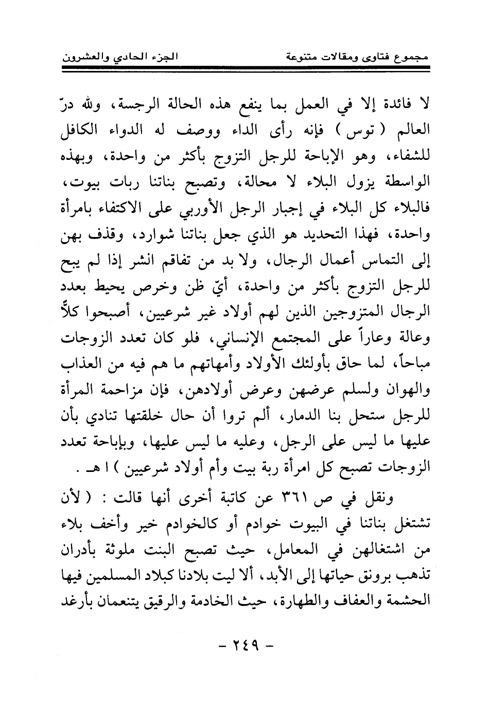 لا فائدة إلا في العمل بما ينفع هذه الحالة الرجيسة، ولله در العالم (توس) فإنه رأى الداء ووصف له الدواء الكافل للشفاء، وهو الإباحة للرجل التزوج بأكثر من واحدة، وبهذه الواسطة يزول البلاء لا محالة، وتصبح بناتنا ربات بيوت، فالبلاء كل البلاء في إجبار الرجل الأوربي على الاكتفاء بامرأة واحدة، فهذا التحديد هو الذي جعل بناتنا شوارد، وقذف بهن إلى التماس أعمال الرجال، ولا بد من تفاقم الشر إذا لم يبح للرجل التزوج بأكثر من واحدة، أي ظن وخرص يحيط بعدد الرجال المتزوجين الذين لهم أولاد غير شرعيين، أصبحوا كلا وعالة وعارا على المجتمع الإنساني، فلو كان تعدد الزوجات مباحا، لما حاق بأولئك الأولاد وأمهاتهم ما هم فيه من العذاب والهوان ولسلم عرضهن وعرض أولادهن، فإن مزاحمة المرأة للرجل ستحل بنا الدمار، ألم تروا أن حال خلقتها تنادي بأن عليها ما ليس على الرجل، وعليه ما ليس عليها، وبإباحة تعدد الزوجات تصبح كل امرأة ربة بيت وأم أولاد شرعيين) اهـ. ونقل في ص 361 عن كاتبة أخرى أنها قالت: (لأن تشتغل بناتنا في البيوت خوادم أو كالخوادم خير وأخف بلاء من اشتغالهن في المعامل، حيث تصبح البنت ملوثة بأدران تذهب برونق حياتها إلى الأبد، ألا ليت بلادنا كبلاد المسلمين فيها الحشمة والعفاف والطهارة، حيث الخادمة والرقيق يتنعمان بأرغد