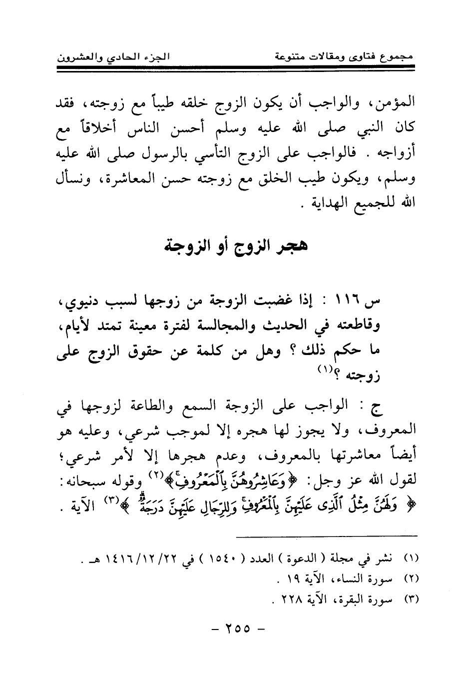 س 116: إذا غضبت الزوجة من زوجها لسبب دنيوي، وقاطعته في الحديث والمجالسة لفترة معينة تمتد لأيام، ما حكم ذلك؟ وهل من كلمة عن حقوق الزوج على زوجته؟ (¬1) .