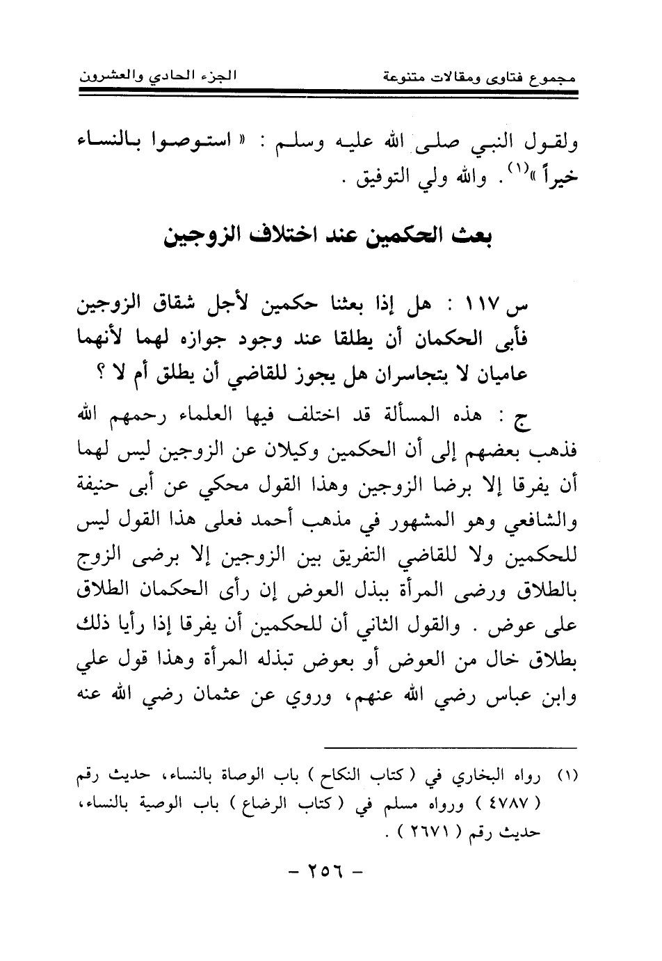 ج: هذه المسألة قد اختلف فيها العلماء رحمهم الله، فذهب بعضهم إلى أن الحكمين وكيلان عن الزوجين ليس لهما أن يفرقا إلا برضا الزوجين، وهذا القول محكي عن أبي حنيفة والشافعي وهو المشهور في مذهب أحمد، فعلى هذا القول ليس للحكمين ولا للقاضي التفريق بين الزوجين إلا برضا الزوج بالطلاق، ورضا المرأة ببذل العوض إن رأى الحكمان الطلاق على عوض. والقول الثاني أن للحكمين أن يفرقا إذا رأيا ذلك بطلاق خال من العوض أو بعوض تبذله المرأة، وهذا قول علي وابن عباس - رضي الله عنهم -، وروي عن عثمان - رضي الله عنه -
