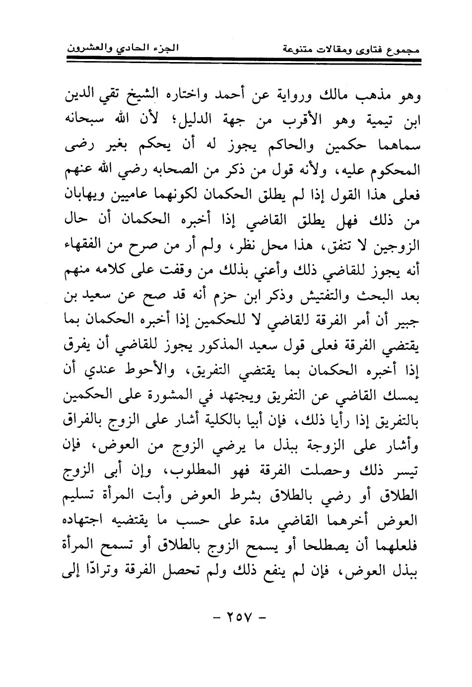 وهو مذهب مالك ورواية عن أحمد، واختاره الشيخ تقي الدين ابن تيمية، وهو الأقرب من جهة الدليل؛ لأن الله سبحانه سماهما حكمين، والحاكم يجوز له أن يحكم بغير رضا المحكوم عليه، ولأنه قول من ذكر من الصحابة - رضي الله عنهم - فعلى هذا القول إذا لم يطلق الحكمان لكونهما عاميين ويهابان من ذلك، فهل يطلق القاضي إذا أخبره الحكمان أن حال الزوجين لا تتفق، هذا محل نظر، ولم أر من صرح من الفقهاء أنه يجوز للقاضي ذلك، وأعني بذلك من وقفت على كلامه منهم بعد البحث والتفتيش، وذكر ابن حزم أنه قد صح عن سعيد بن جبير أن أمر الفرقة للقاضي لا للحكمين إذا أخبره الحكمان بما يقتضي الفرقة، فعلى قول سعيد المذكور يجوز للقاضي أن يفرق إذا أخبر الحكمان بما يقتضي التفريق، والأحوط عندي أن يمسك القاضي عن التفريق ويجتهد في المشورة على الحكمين بالتفريق إذا رأيا ذلك، فإن أبيا بالكلية أشار على الزوج بالفراق، وأشار على الزوجة ببذل ما يرضي الزوج من العوض، فإن تيسر ذلك وحصلت الفرقة فهو المطلوب، وإن أبى الزوج الطلاق أو رضي بالطلاق بشرط العوض وأبت المرأة تسليم العوض أخرهما القاضي مدة على حسب ما يقتضيه اجتهاده فلعلهما أن يصطلحا أو يسمح الزوج بالطلاق أو تسمح المرأة ببذل العوض، فإن لم ينفع ذلك، ولم تحصل الفرقة وترادا إلى