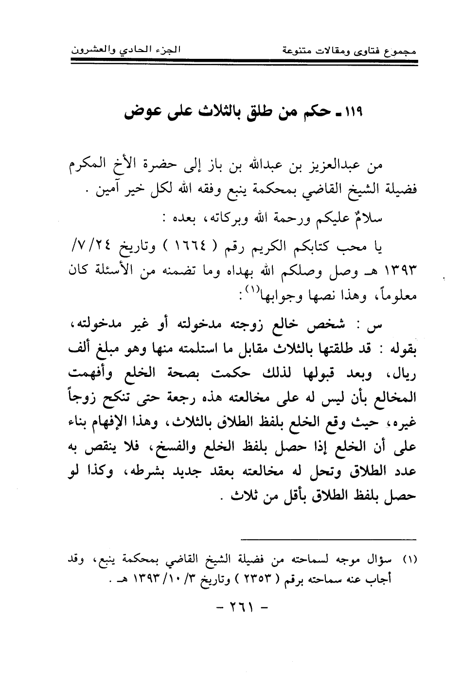119 - حكم من طلق بالثلاث على عوض