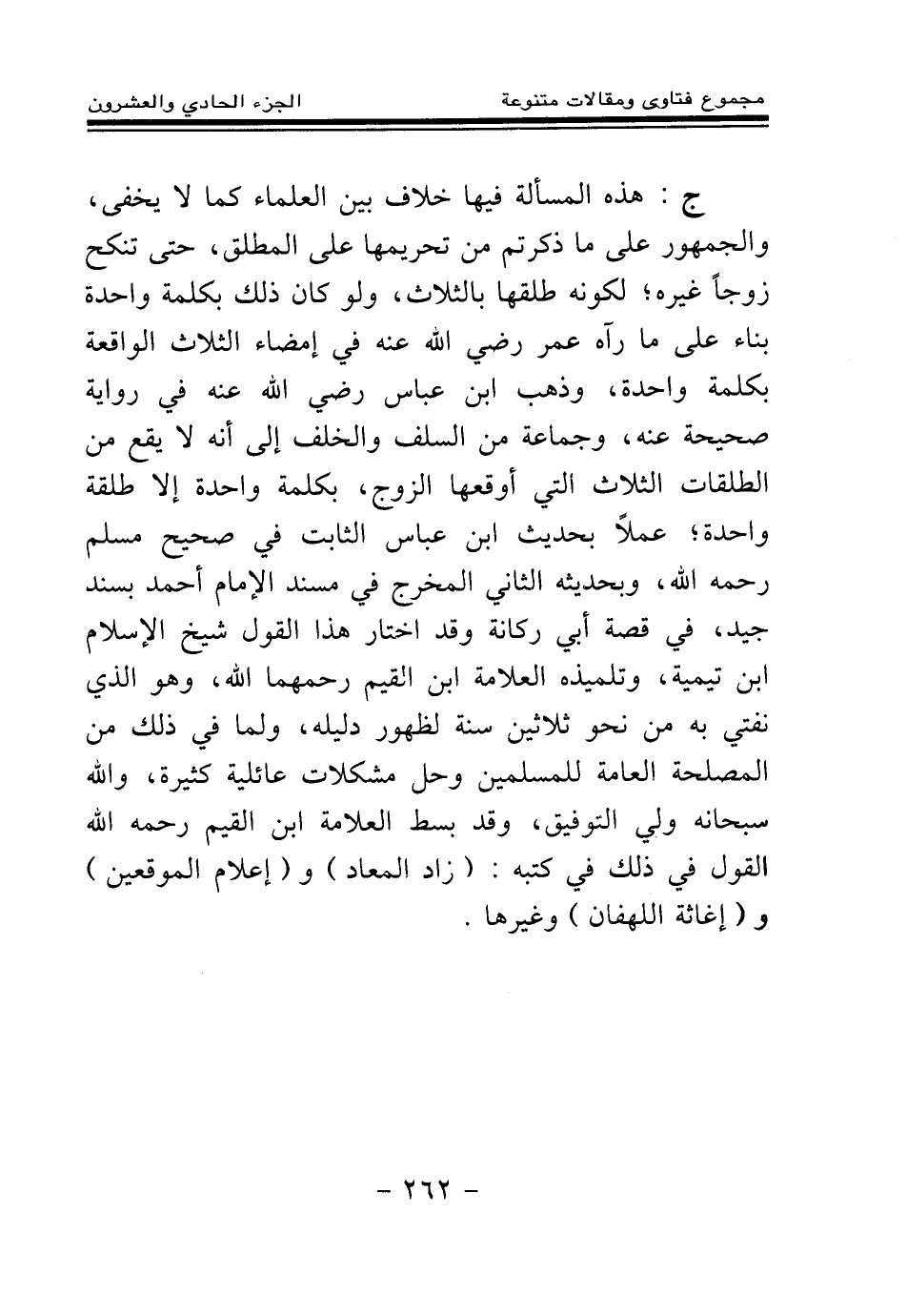 ج: هذه المسألة فيها خلاف بين العلماء كما لا يخفى، والجمهور على ما ذكرتم من تحريمها على المطلق، حتى تنكح زوجا غيره؛ لكونه طلقها بالثلاث، ولو كان ذلك بكلمة واحدة بناء على ما رآه عمر - رضي الله عنه - في إمضاء الثلاث الواقعة بكلمة واحدة، وذهب ابن عباس - رضي الله عنه - في رواية صحيحة عنه، وجماعة من السلف والخلف إلى أنه لا يقع من الطلقات الثلاث التي أوقعها الزوج، بكلمة واحدة إلا طلقة واحدة؛ عملا بحديث ابن عباس الثابت في صحيح مسلم رحمه الله، وبحديثه الثاني المخرج في مسند الإمام أحمد بسند جيد، في قصة أبي ركانة، وقد اختار هذا القول شيخ الإسلام ابن تيمية، وتلميذه العلامة ابن القيم رحمهما الله، وهو الذي نفتي به من نحو ثلاثين سنة لظهور دليله، ولما في ذلك من المصلحة العامة للمسلمين، وحل مشكلات عائلية كثيرة، والله سبحانه ولي التوفيق، وقد بسط العلامة ابن القيم رحمه الله القول في ذلك في كتبه: (زاد المعاد) و (إعلام الموقعين) و (إغاثة اللهفان) وغيرها.