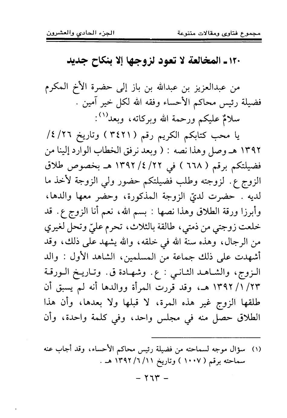 يا محب كتابكم الكريم رقم (3421) وتاريخ 26\4\1392هـ وصل وهذا نصه: (وبعد نرفق الخطاب الوارد إلينا من فضيلتكم برقم (668) في 22\4\1392هـ بخصوص طلاق الزوج ع. لزوجته، وطلب فضيلتكم حضور ولي الزوجة لأخذ ما لديه. حضرت لدي الزوجة المذكورة، وحضر معها والدها، وأبرزا ورقة الطلاق وهذا نصها: بسم الله، نعم أنا الزوج ع. قد خلعت زوجتي من ذمتي، طالقة بالثلاث، تحرم علي وتحل لغيري من الرجال، وهذه سنة الله في خلقه، والله يشهد على ذلك، وقد أشهدت على ذلك جماعة من المسلمين، الشاهد الأول: والد الزوج، والشاهد الثاني: ع. وشهادة ق. وتاريخ الورقة 23\1\1392هـ، وقد قررت المرأة ووالدها أنه لم يسبق أن طلقها الزوج غير هذه المرة، لا قبلها ولا بعدها، وأن هذا الطلاق حصل منه في مجلس واحد، وفي كلمة واحدة، وأن