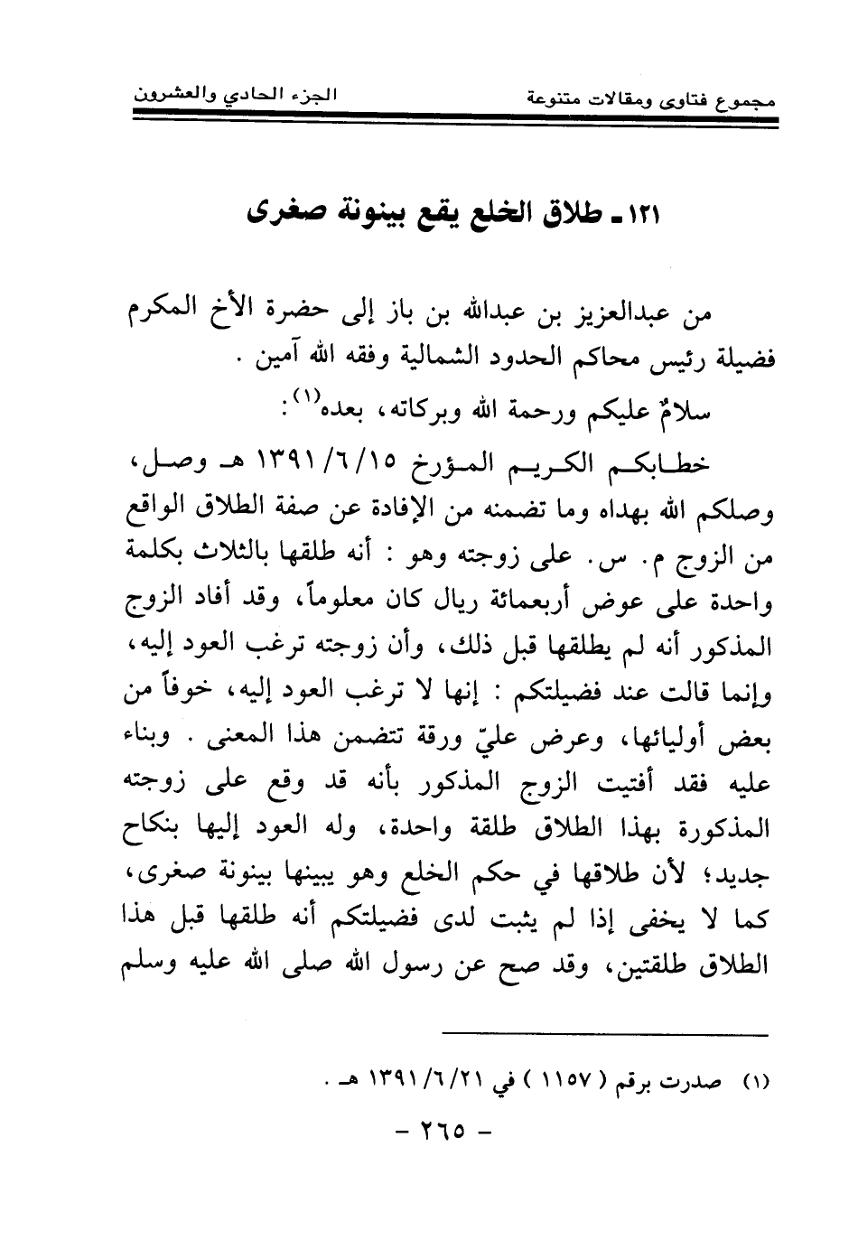 خطابكم الكريم المؤرخ 15\6\1391هـ وصل، وصلكم الله بهداه وما تضمنه من الإفادة عن صفة الطلاق الواقع من الزوج م. س. على زوجته، وهو: أنه طلقها بالثلاث بكلمة واحدة على عوض أربعمائة ريال كان معلوما، وقيد أفاد الزوج المذكور أنه لم يطلقها قبل ذلك، وأن زوجته ترغب العود إليه، وإنما قالت عند فضيلتكم: إنها لا ترغب العود إليه، خوفا من بعض أوليائها، وعرض علي ورقة تتضمن هذا المعنى.