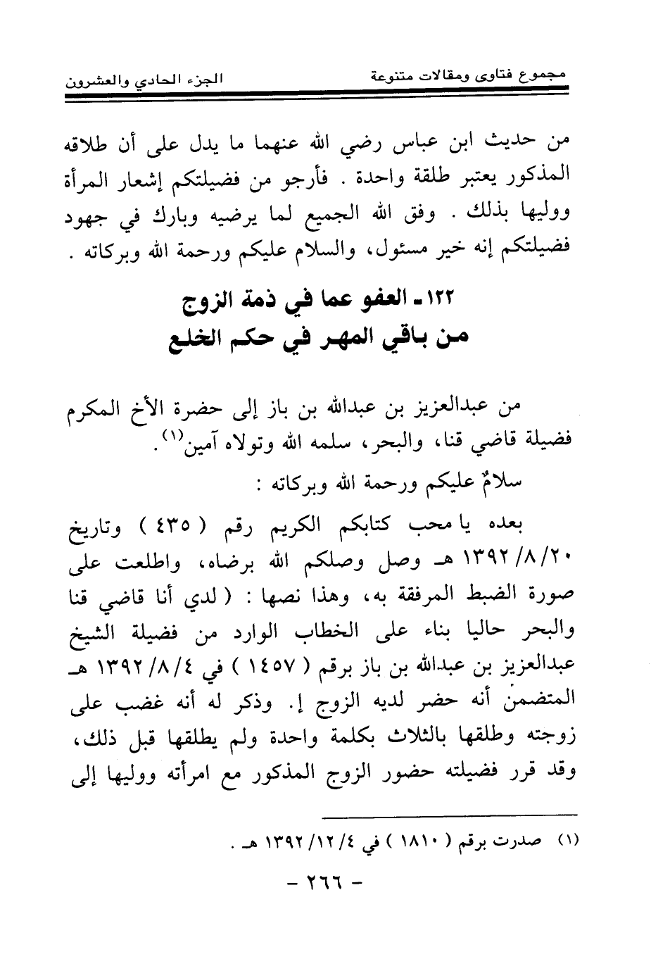بعده يا محب كتابكم الكريم رقم (435) وتاريخ 20\8\1392هـ وصل وصلكم الله برضاه، واطلعت على صورة الضبط المرفقة به، وهذا نصها: (لدي أنا قاضي قنا والبحر حاليا بناء على الخطاب الوارد من فضيلة الشيخ عبد العزيز بن عبد الله بن باز برقم (1457) في 4\8\1392هـ المتضمن أنه حضر لديه الزوج إ. وذكر له أنه غضب على زوجته وطلقها بالثلاث بكلمة واحدة، ولم يطلقها قبل ذلك، وقد قرر فضيلته حضور الزوج المذكور مع امرأته ووليها إلى