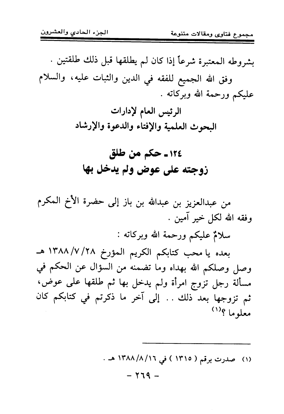 بعده يا محب كتابكم الكريم المؤرخ 28\7\1388هـ وصل وصلكم الله بهداه، وما تضمنه من السؤال عن الحكم في مسألة رجل تزوج امرأة ولم يدخل بها ثم طلقها على عوض، ثم تزوجها بعد ذلك. . إلى آخر ما ذكرتم في كتابكم كان معلوما؟ (¬1) .