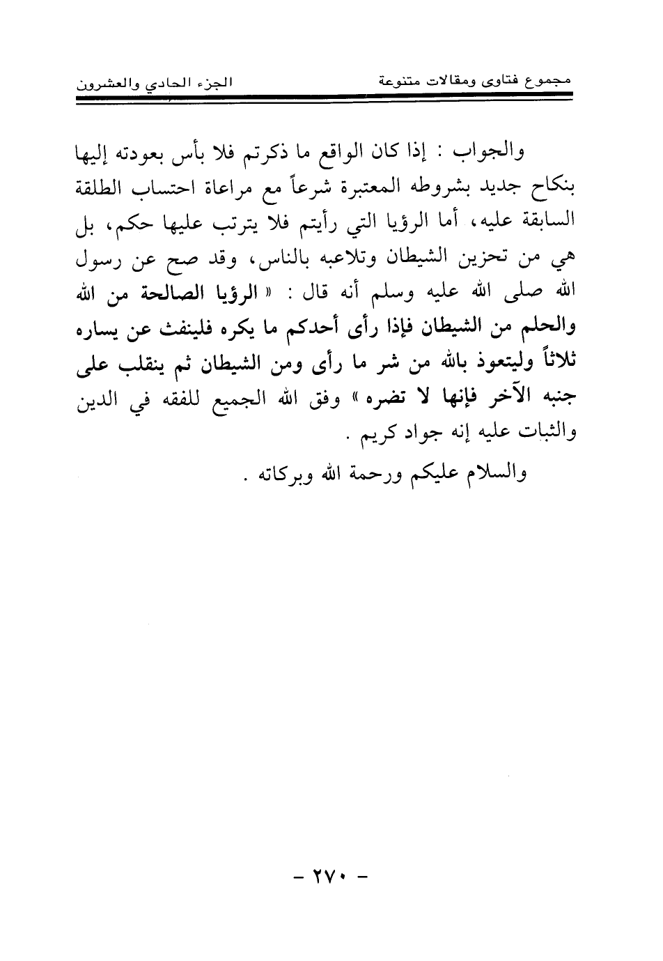 والجواب: إذا كان الواقع ما ذكرتم فلا بأس بعودته إليها بنكاح جديد بشروطه المعتبرة شرعا مع مراعاة احتساب الطلقة السابقة عليه، أما الرؤيا التي رأيتم فلا يترتب عليها حكم، بل هي من تحزين الشيطان وتلاعبه بالناس، وقد صح عن رسول الله - صلى الله عليه وسلم - أنه قال: «الرؤيا الصالحة من الله، والحلم من الشيطان، فإذا رأى أحدكم ما يكره فلينفث عن يساره ثلاثا، وليتعوذ بالله من شر ما رأى ومن الشيطان، ثم ينقلب على جنبه الآخر، فإنها لا تضره (¬1) » وفق الله الجميع للفقه في الدين والثبات عليه إنه جواد كريم.