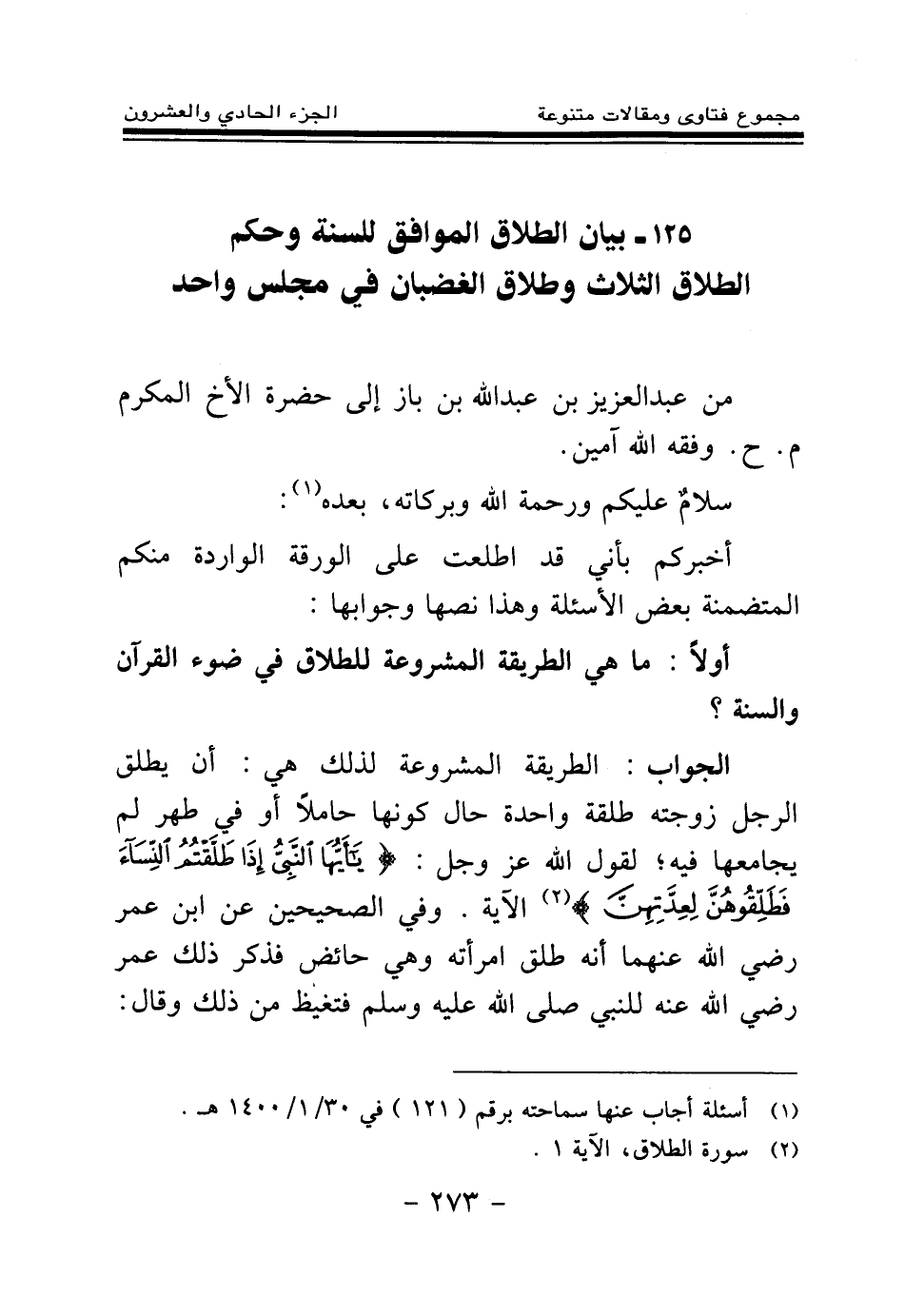 الجواب: الطريقة المشروعة لذلك هي: أن يطلق الرجل زوجته طلقة واحدة حال كونها حاملا أو في طهر لم يجامعها فيه؛ لقول الله عز وجل: {يَا أَيُّهَا النَّبِيُّ إِذَا طَلَّقْتُمُ النِّسَاءَ فَطَلِّقُوهُنَّ لِعِدَّتِهِنَّ} (¬2) الآية. وفي الصحيحين عن ابن عمر - رضي الله عنهما - أنه طلق امرأته وهي حائض فذكر ذلك عمر - رضي الله عنه - للنبي - صلى الله عليه وسلم - فتغيظ من ذلك، وقال: