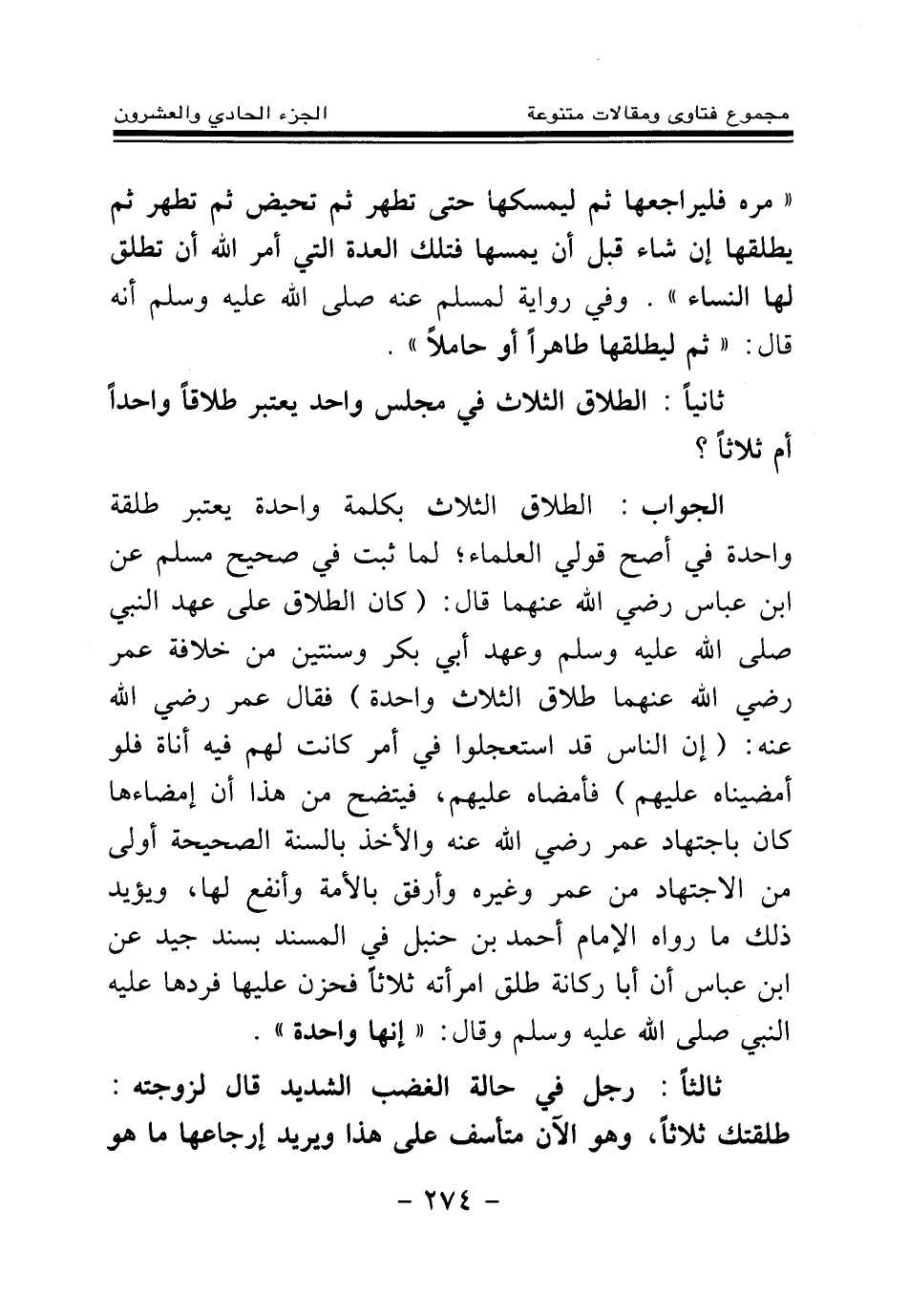 الجواب: الطلاق الثلاث بكلمة واحدة يعتبر طلقة واحدة في أصح قولي العلماء؛ لما ثبت في صحيح مسلم عن ابن عباس - رضي الله عنهما - قال: (كان الطلاق على عهد النبي - صلى الله عليه وسلم - وعهد أبي بكر وسنتين من خلافة عمر - رضي الله عنهما - طلاق الثلاث واحدة) فقال عمر - رضي الله عنه -: (إن الناس قد استعجلوا في أمر كانت لهم فيه أناة فلو أمضيناه عليهم) فأمضاه عليهم، فيتضح من هذا أن إمضاءها كان باجتهاد عمر - رضي الله عنه - والأخذ بالسنة الصحيحة أولى من الاجتهاد من عمر وغيره وأرفق بالأمة وأنفع لها، ويؤيد ذلك ما رواه الإمام أحمد بن حنبل في المسند بسند جيد عن ابن عباس أن أبا ركانة طلق امرأته ثلاثا فحزن عليها فردها عليه النبي - صلى الله عليه وسلم - وقال: «إنها واحدة» .