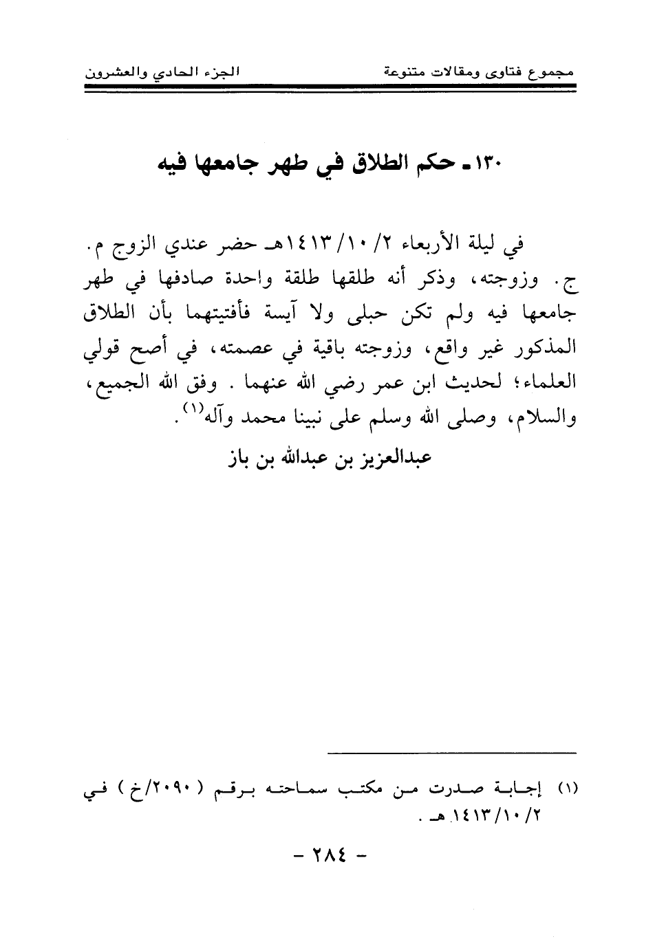 فأفتيتهما بأن الطلاق المذكور غير واقع، وزوجته باقية في عصمته، في أصح قولي العلماء؛ لحديث ابن عمر - رضي الله عنهما - وفق الله الجميع، والسلام، وصلى الله وسلم على نبينا محمد وآله (¬1) .