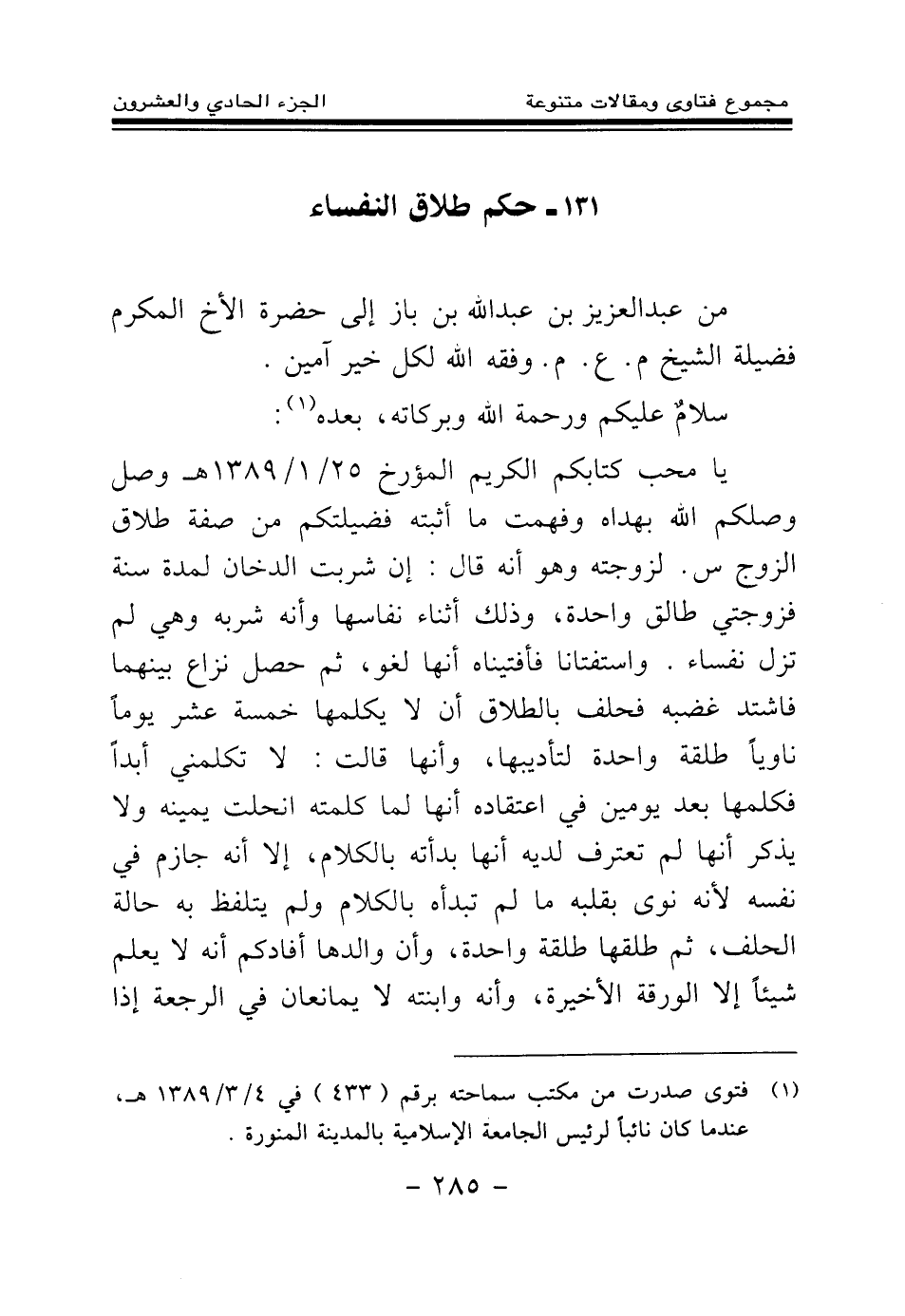 يا محب كتابكم الكريم المؤرخ 25\1\1389هـ وصل وصلكم الله بهداه، وفهمت ما أثبته فضيلتكم من صفة طلاق الزوج س. لزوجته وهو أنه قال: إن شربت الدخان لمدة سنة فزوجتي طالق واحدة، وذلك أثناء نفاسها، وأنه شربه وهي لم تزل نفساء. واستفتانا فأفتيناه أنها لغو، ثم حصل نزاع بينهما فاشتد غضبه. فحلف بالطلاق أن لا يكلمها خمسة عشر يوما ناويا طلقة واحدة لتأديبها، وأنها قالت: لا تكلمني أبدا فكلمها بعد يومين في اعتقاده أنها لما كلمته انحلت يمينه ولا يذكر أنها لم تعترف لديه أنها بدأته بالكلام، إلا أنه جازم في نفسه؛ لأنه نوى بقلبه ما لم تبدأه بالكلام ولم يتلفظ به حالة الحلف، ثم طلقها طلقة واحدة، وأن والدها أفادكم أنه لا يعلم شيئا إلا الورقة الأخيرة، وأنه وابنته لا يمانعان في الرجعة إذا
