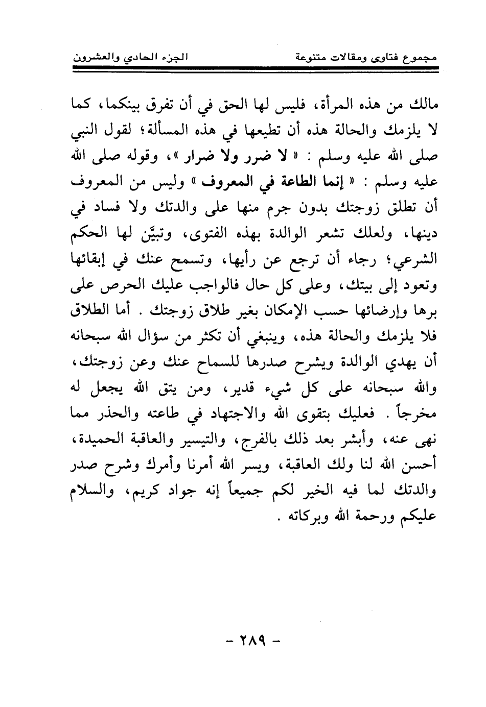 مالك من هذه المرأة، فليس لها الحق في أن تفرق بينكما، كما لا يلزمك والحالة هذه أن تطيعها في هذه المسألة؛ لقول النبي - صلى الله عليه وسلم -: «لا ضرر ولا ضرار (¬1) » ، وقوله - صلى الله عليه وسلم -: «إنما الطاعة في المعروف (¬2) » وليس من المعروف أن تطلق زوجتك بدون جرم منها على والدتك ولا فساد في دينها، ولعلك تشعر الوالدة بهذه الفتوى، وتبين لها الحكم الشرعي، رجاء أن ترجع عن رأيها، وتسمح عنك في إبقائها وتعود إلى بيتك، وعلى كل حال فالواجب عليك الحرص على برها إرضائها حسب المكان بغير طلاق زوجتك. أما الطلاق فلا يلزمك والحالة هذه، وينبغي أن تكثر من سؤال الله وسبحانه أن يهدي الوالدة ويشرح صدرها للسماح عنك وعن زوجتك، والله سبحانه على كل شيء قدير، ومن يتق الله يجعل له مخرجا. فعليك بتقوى الله والاجتهاد في طاعته والحذر مما نهى عنه، وأبشر بعد ذلك بالفرج، والتيسير والعاقبة الحميدة، أحسن الله لنا ولك العاقبة، ويسر الله أمرنا وأمرك وشرح صدر والدتك لما فيه الخير لكم جميعا إنه جواد كريم، والسلام عليكم ورحيمة الله وبركاته.