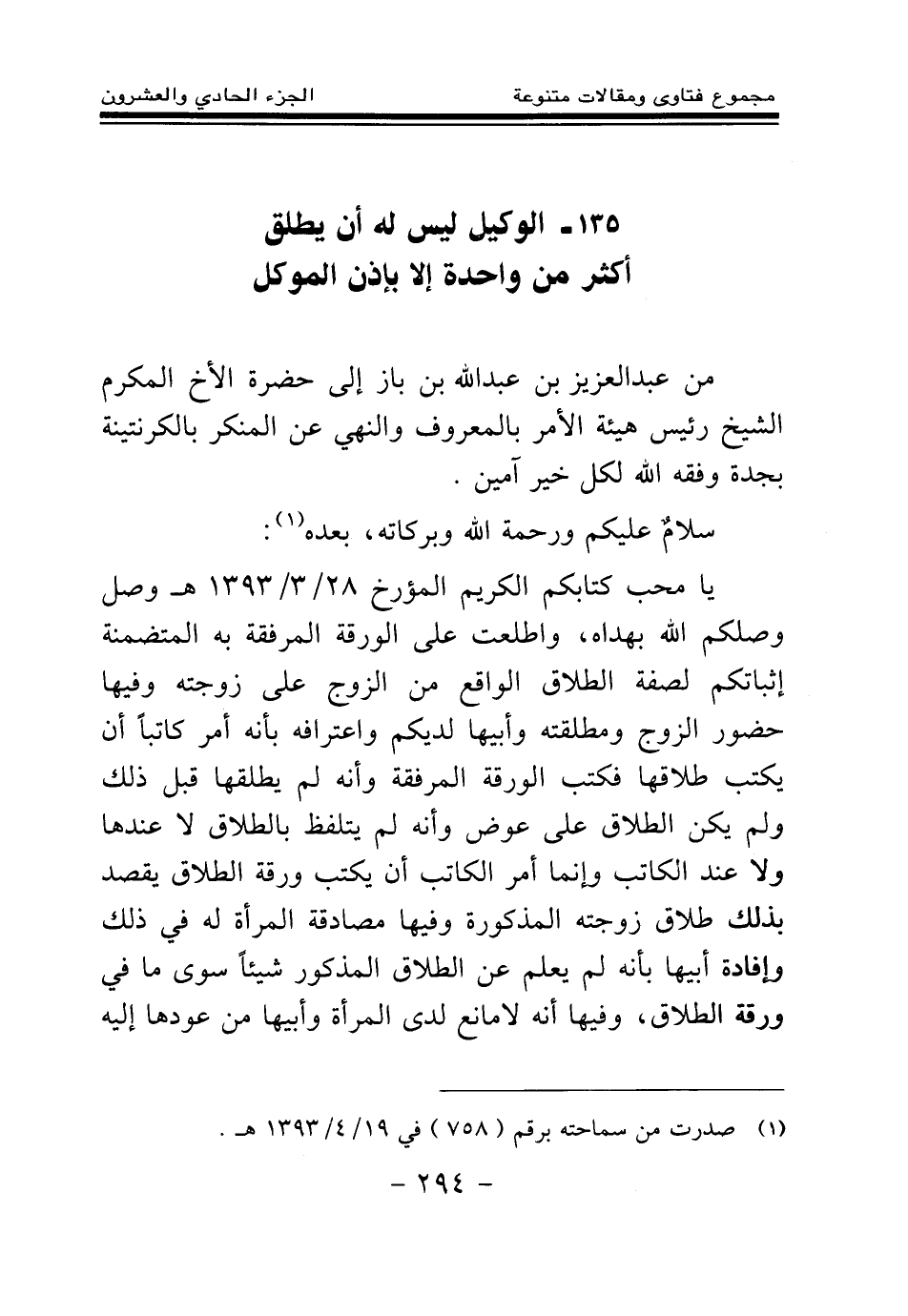 يا محب كتابكم الكريم المؤرخ 28\3\1393هـ وصل وصلكم الله بهداه، واطلعت على الورقة المرفقة به المتضمنة إثباتكم لصفة الطلاق الواقع من الزوج على زوجته، وفيها للزوج ومطلقته وأبيها لديكم، واعترافه بأنه أمر كاتبا أن يكتب طلاقها فكتب الورقة المرفقة، وأنه لم يطلقها قبل ذلك، ولم يكن الطلاق على عوض، وأنه لم يتلفظ بالطلاق لا عندها ولا عند الكاتب، وإنما أمر الكاتب أن يكتب صدقة الطلاق يقصد بذلك طلاق زوجته المذكورة، وفيها مصادقة المرأة له في ذلك، وإفادة أبيها بأنه لم يعلم عن الطلاق المذكور شيئا سوى ما في ورقة الطلاق، وفيها أنه لا مانع لدى المرأة وأبيها من عودها إليه