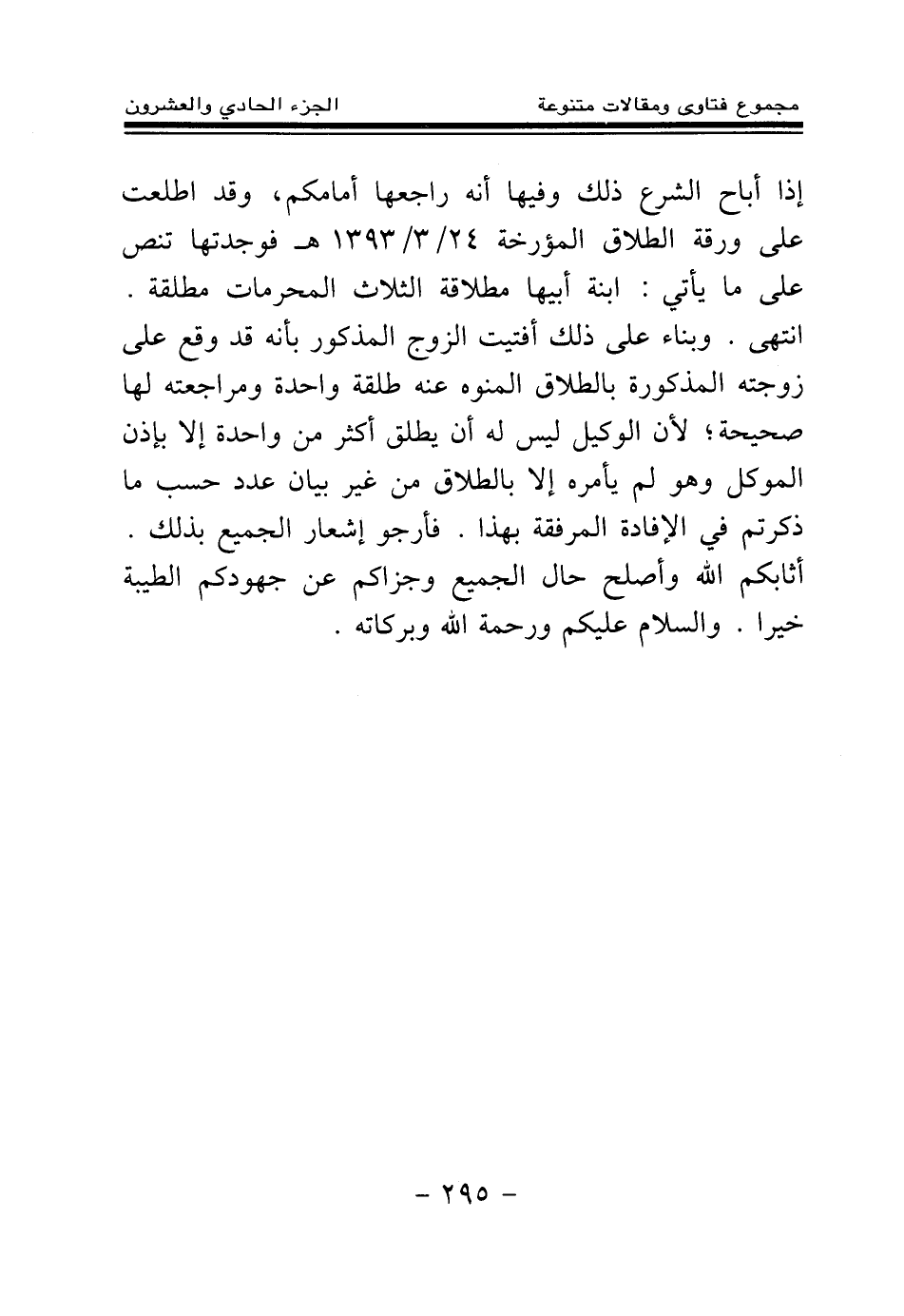 وبناء على ذلك أفتيت الزوج المذكور بأنه قد وقع على زوجته المذكورة بالطلاق المنوه عنه طلقة واحدة ومراجعته لها صحيحة؛ لأن الوكيل ليس له أن يطلق أكثر من واحدة إلا بإذن الموكل، وهو لم يأمره إلا بالطلاق من غير بيان عدد حسب ما ذكرتم في الإفادة المرفقة بهذا. فأرجو إشعار الجميع بذلك. أثابكم الله، وأصلح حال الجميع، وجزاكم عن جهودكم الطيبة خيرا. والسلام عليكم ورحمة الله وبركاته.