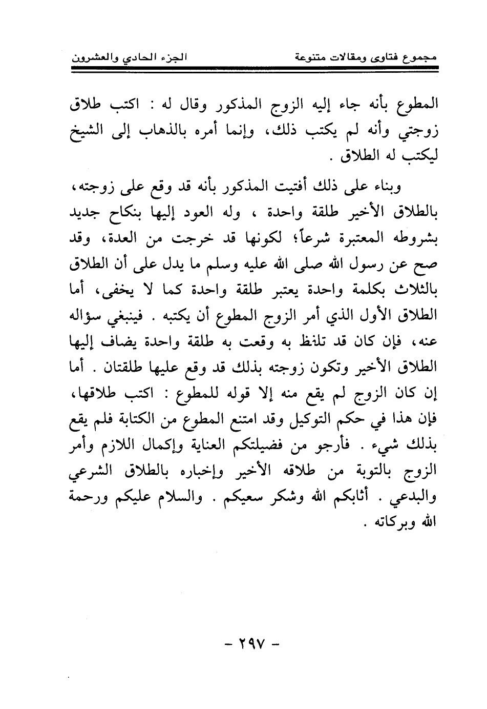 وبناء على ذلك أفتيت المذكور بأنه قد وقع على زوجته، بالطلاق الأخير طلقة واحدة، وله العود إليها بنكاح جديد بشروطه المعتبرة شرعا؛ لكونها قد خرجت من العدة، وقد صح عن رسول الله - صلى الله عليه وسلم - ما يدل على أن الطلاق بالثلاث بكلمة واحدة يعتبر طلقة واحدة كما لا يخفى، أما الطلاق الأول الذي أمر الزوج المطوع أن يكتبه. فينبغي سؤاله عنه، فإن كان قد تلفظ به وقعت به طلقة واحدة يضاف إليها الطلاق الأخير وتكون زوجته بذلك قد وقع عليها طلقتان. أما إن كان الزوج لم يقع منه إلا قوله للمطوع: اكتب طلاقها، فإن هذا في حكم التوكيل وقد امتنع المطوع من الكتابة فلم يقع بذلك شيء. فأرجو من فضيلتكم العناية وإكمال اللازم وأمر الزوج بالتوبة من طلاقه الأخير وإخباره بالطلاق الشرعي والبدعي. أثابكم الله وشكر سعيكم. والسلام عليكم ورحمة الله وبركاته.