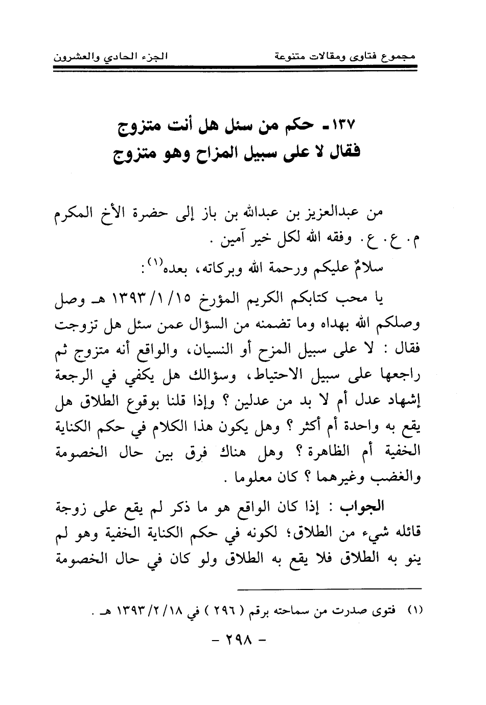 يا محب كتابكم الكريم المؤرخ 15\1\1393هـ وصل وصلكم الله بهداه، وما تضمنه من السؤال عمن سئل هل تزوجت؟ فقال: لا على سبيل المزاح أو النسيان، والواقع أنه متزوج ثم راجعها على سبيل الاحتياط، وسؤالك هل يكفي في الرجعة إشهاد العدل أم لا بد من عدلين؟ وإذا قلنا بوقوع الطلاق هل يقع به واحدة أم كثر؟ وهل يكون هذا الكلام في حكم الكناية الخفية أم الظاهرة؟ وهل هناك فرق بين حال الخصومة والغضب وغيرهما؟ كان معلوما.