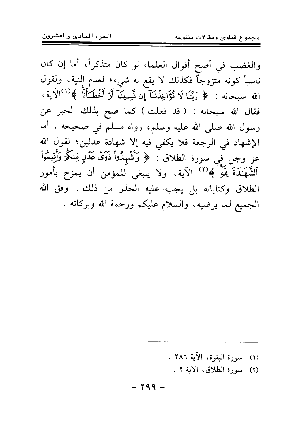 والغضب في أصح أقوال العلماء لو كان متذكرا، أما إن كان ناسيا كونه متزوجا فكذلك لا يقع به شيء؛ لعدم النية، ولقول الله سبحانه: {رَبَّنَا لَا تُؤَاخِذْنَا إِنْ نَسِينَا أَوْ أَخْطَأْنَا} (¬1) الآية، فقال الله سبحانه: (قد فعلت) كما صح بذلك الخبر عن رسول الله - صلى الله عليه وسلم - رواه مسلم في صحيحه. أما الإشهاد في الرجعة فلا يكفي فيه إلا شهادة عدلين؛ لقول الله عز رجل في سورة الطلاق: {وَأَشْهِدُوا ذَوَيْ عَدْلٍ مِنْكُمْ وَأَقِيمُوا الشَّهَادَةَ لِلَّهِ} (¬2) الآية، ولا ينبغي للمؤمن أن يمزح بأمور الطلاق وكناياته، بل يجب عليه الحذر من ذلك. وفق الله الجميع لما يرضيه، والسلام عليكم ورحمة الله وبركاته.