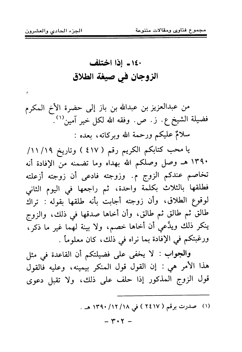 يا محب كتابكم الكريم رقم (417) وتاريخ 19\11\1390هـ وصل وصلكم الله بهداه، وما تضمنه من الإفادة أنه تخاصم عندكم الزوج م. وزوجته فادعى أن زوجته أزعلته، فطلقها بالثلاث بكلمة واحدة، ثم راجعها في اليوم الثاني لوقوع الطلاق، وأن زوجته أجابت بأنه طلقها بقوله: تراك طالق ثم طالق ثم طالق، وأن أخاها صدقها في ذلك، والزوج ينكر ذلك ويدعي أن أخاها خصم؛ ولا بينة لهما غير ما ذكر، ورغبتكم في الإفادة بما نراه في ذلك، كان معلوما.