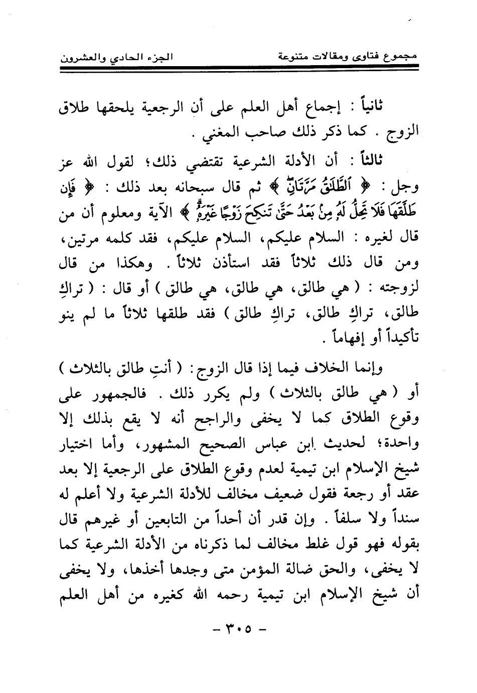 وإنما الخلاف فيما إذا قال الزوج: (أنت طالق بالثلاث) أو (هي طالق بالثلاث) ولم يكرر ذلك. فالجمهور على وقوع الطلاق كما لا يخفى والراجح أنه لا يقع بذلك إلا واحدة؛ لحديث ابن عباس الصحيح المشهور، وأما اختيار شيخ الإسلام ابن تيمية لعدم وقوع الطلاق على الرجعية إلا بعد عقد أو رجعة فقول ضعيف مخالف للأدلة الشرعية، ولا أعلم له سندا ولا سلفا. وإن قدر أن أحدا من التابعين أو غيرهم قال بقوله فهو قول غلط مخالف لما ذكرناه من الأدلة الشرعية كما لا يخفى، والحق ضالة المؤمن، متى وجدها أخذها، ولا يخفى أن شيخ الإسلام ابن تيمية رحمه الله كغيره من أهل العلم