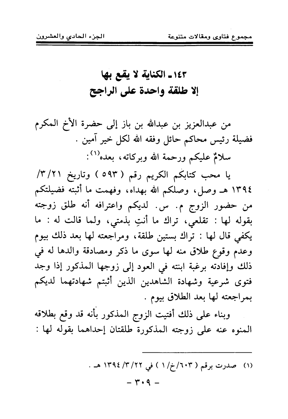 من عبد العزيز بن عبد الله بن باز إلى حضرة الأخ المكرم فضيلة رئيس محاكم حائل، وفقه الله لكل خير، آمين.