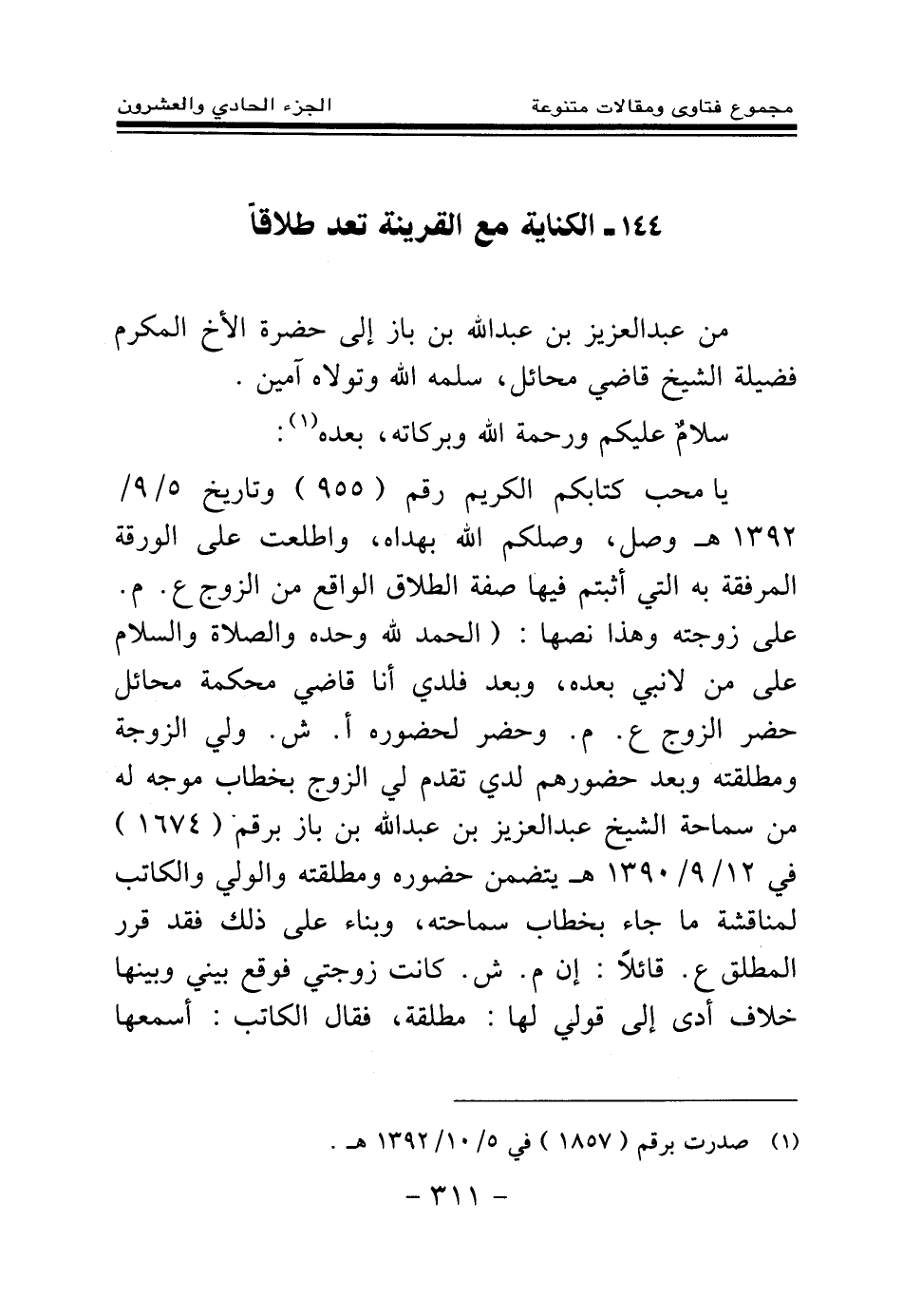يا محب كتابكم الكريم رقم (955) وتاريخ 5\9\1392هـ وصل، وصلكم الله بهداه، واطلعت على الورقة المرفقة به التي أثبتم فيها صفة الطلاق الواقع من الزوج ع. م. به على زوجته وهذا نصها: (الحمد لله، والصلاة والسلام على من لا نبي بعده، وبعد فلدي أنا قاضي محكمة محائل حضر الزوج ع. م. وحضر لحضوره أ. ش. ولي الزوجة ومطلقته، وبعد حضورهم لدي تقدم لي الزوج بخطاب موجه له من سماحة الشيخ عبد العزيز بن عبد الله بن باز برقم (1674) في 12\9\1390هـ يتضمن حضوره ومطلقته والولي والكاتب لمناقشة ما جاء بخطاب سماحته، وبناء على ذلك فقد قرر المطلق ع. قائلا: إن م. ش. كانت زوجتي فوقع بيني وبينها خلاف أدى إلى قولي لها: مطلقة، فقال الكاتب: أسمعها