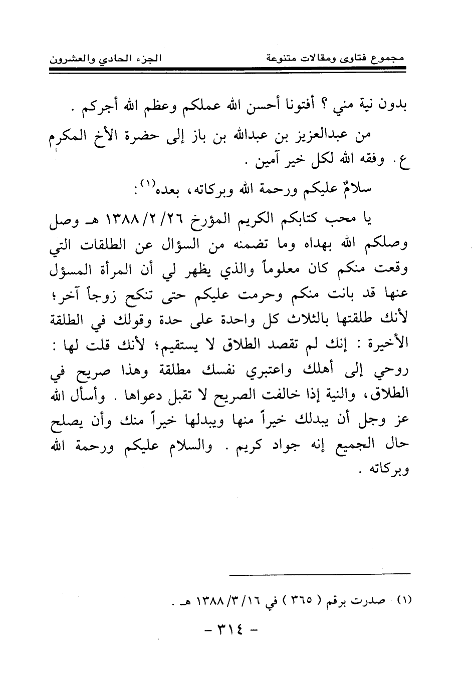 يا محب كتابكم الكريم المؤرخ 26\2\1388هـ وصل وصلكم الله بهداه، وما تضمنه من السؤال عن الطلقات التي وقعت منكم كان معلوما، والذي يظهر لي أن المرأة المسئول عنها قد بانت منكم، وحرمت عليكم حتى تنكح زوجا آخر؛ لأنك طلقتها بالثلاث كل واحدة على حدة، وقولك في الطلقة الأخيرة: إنك لم تقصد الطلاق لا يستقيم؛ لأنك قلت لها: روحي إلى أهلك واعتبري نفسك مطلقة، وهذا صريح في الطلاق، والنية إذا خالفت الصريح لا تقبل دعواها. وأسأل الله عز رجل أن يبدلك خيرا منها، ويبدلها خيرا منك، وأن يصلح حال الجميع، إنه جواد كريم. والسلام عليكم ورحمة الله وبركاته.
