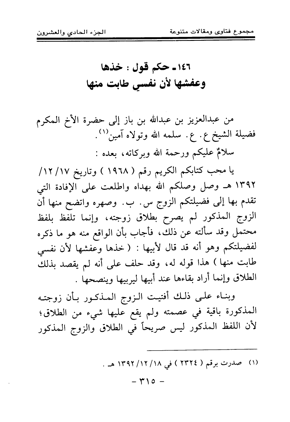 يا محب كتابكم الكريم رقم (1968) وتاريخ 17\12\1392هـ وصل وصلكم الله بهداه، واطلعت على الإفادة التي تقدم بها إلى فضيلتكم الزوج س. ب. وصهره واتضح منها أن الزوج المذكور لم يصرح بطلاق زوجته، إنما تلفظ بلفظ محتمل، وقد سألته عن ذلك، فأجاب بأن الواقع منه هو ما ذكره لفضيلتكم وهو أنه قد قال لأبيها: (خذها وعفشها؛ لأن نفسي طابت منها) هذا قوله له، وقد حلف على أنه لم يقصد بذلك الطلاق، وإنما أراد بقاءها عند أبيها ليربيها وينصحها.