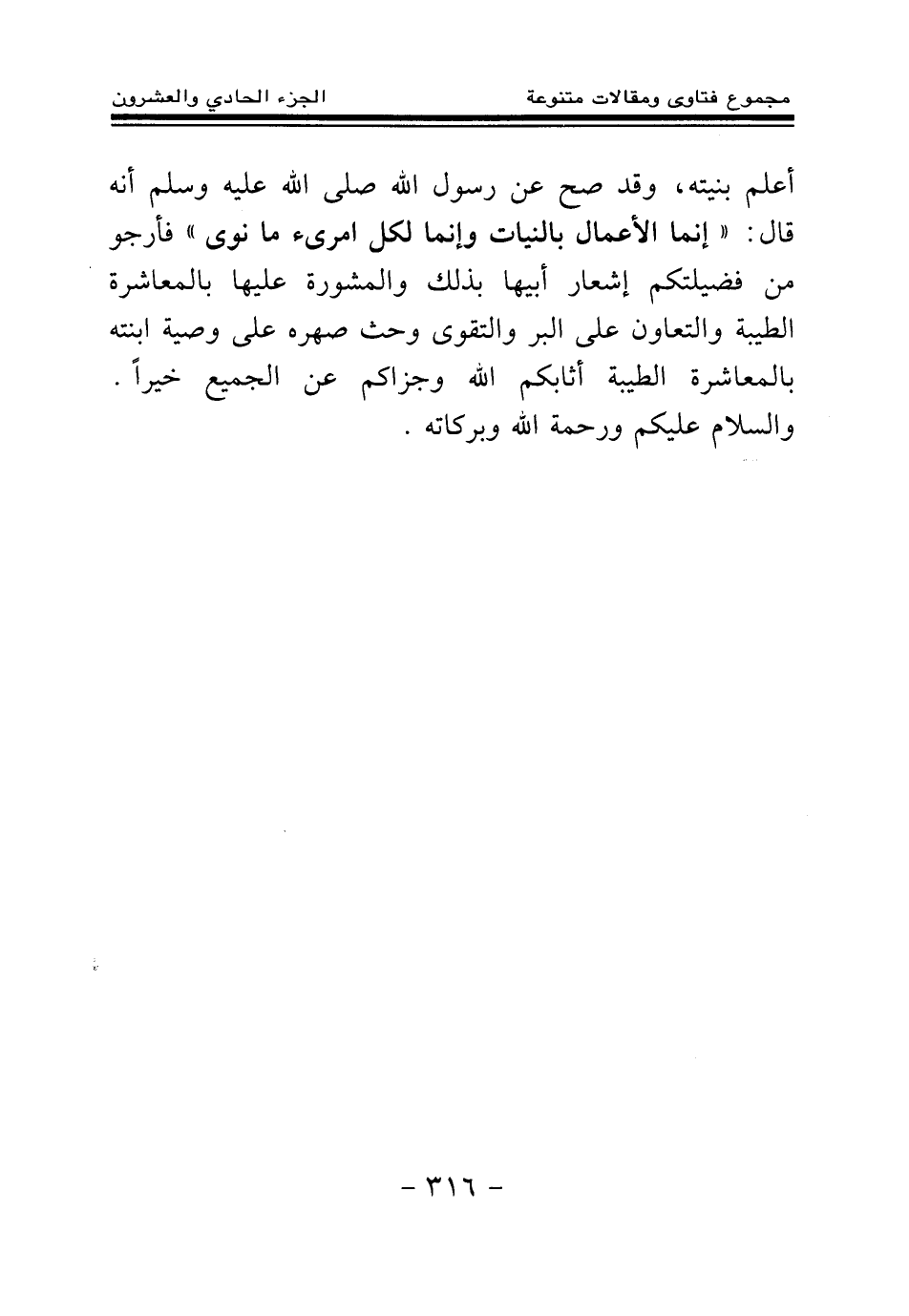 أعلم بنيته، وقد صح عن رسول الله - صلى الله عليه وسلم - أنه قال: «إنما الأعمال بالنيات، وإنما لكل امرئ ما نوى (¬1) » فأرجو من فضيلتكم إشعار أبيها بذلك، والمشورة عليها بالمعاشرة الطيبة والتعاون على البر والتقوى، وحث صهره على وصية ابنته بالمعاشرة الطيبة، أثابكم الله، وجزاكم عن الجميع خيرا. والسلام عليكم ورحمة الله وبركاته.