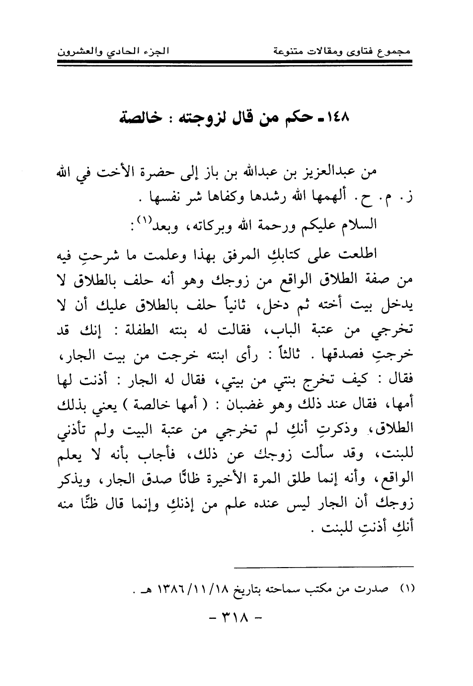 من عبد العزيز بن عبد الله بن باز إلى حضرة الأخت في الله ز. م. ح. ألهمها الله رشدها، وكفاها شر نفسها.