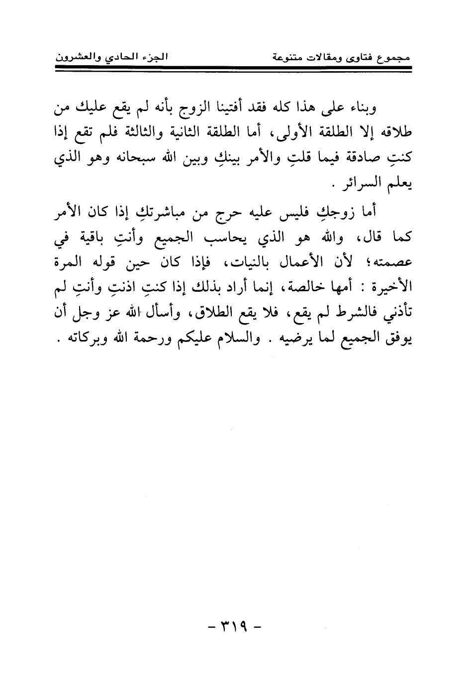 أما زوجك فليس عليه حرج من مباشرتك إذا كان الأمر كما قال، والله هو الذي يحاسب الجميع، وأنت باقية في عصمته؛ لأن الأعمال بالنيات، فإذا كان حين قوله المرة الأخيرة: أمها خالصة، إنما أراد بذلك إذا كنت أذنت وأنت لم تأذني فالشرط لم يقع، فلا يقع الطلاق، وأسأل الله عز وجل أن يوفق الجميع لما يرضيه. والسلام عليكم ورحمة الله وبركاته.
