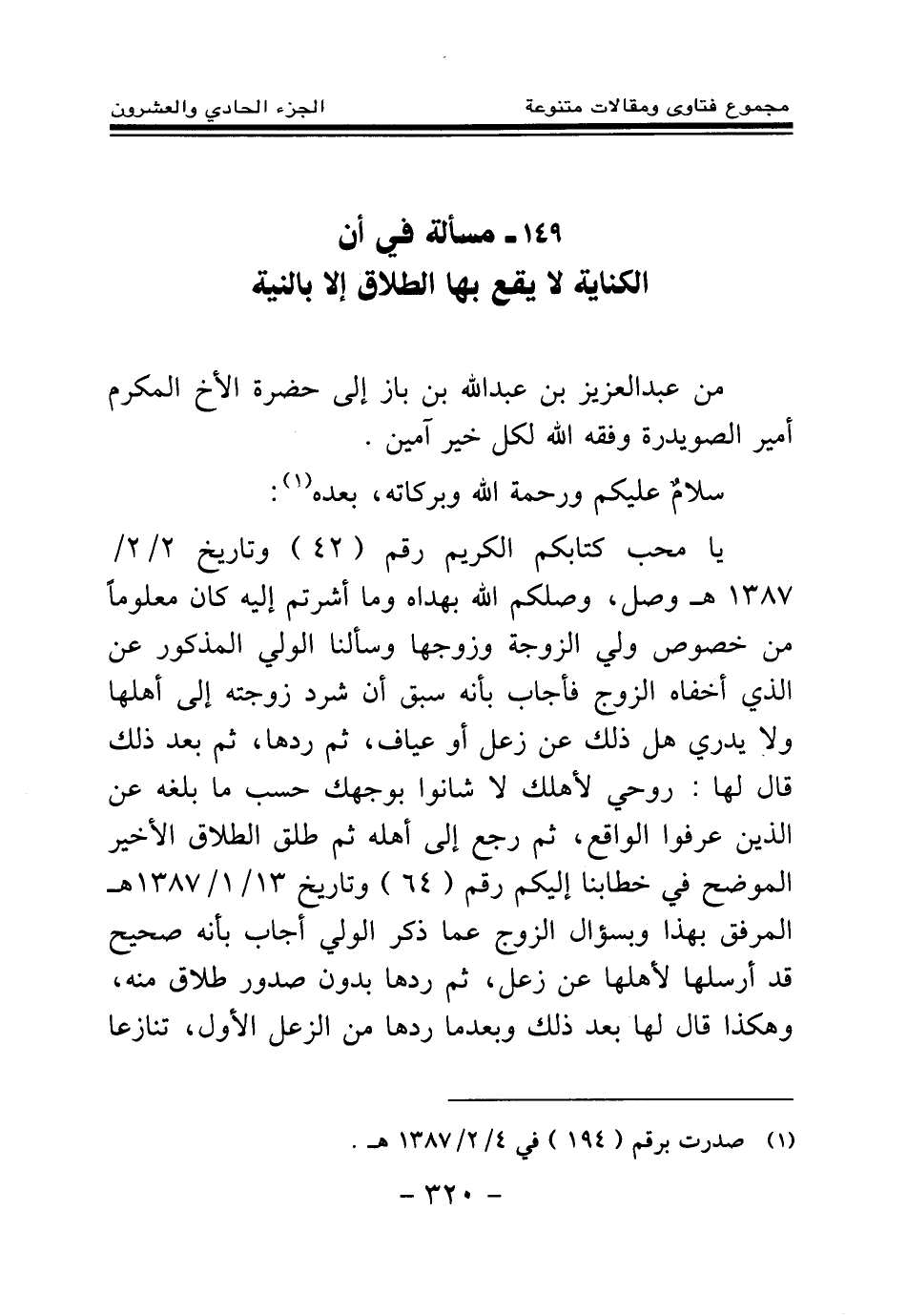 يا محب كتابكم الكريم رقم (42) وتاريخ 2\2\1387هـ وصل، وصلكم الله بهداه، وما أشرتم إليه كان معلوما من خصوص ولي الزوجة وزوجها، وسألنا الولي المذكور عن الذي أخفاه الزوج فأجاب بأنه سبق أن شرد زوجته إلى أهلها ولا يدري هل ذلك عن زعل أو عياف، ثم ردها، ثم بعد ذلك قال لها: روحي لأهلك لا شانوا بوجهك، حسب ما بلغه عن الذين عرفوا الواقع، ثم رجع إلى أهله ثم طلق الطلاق الأخير الموضع في خطابنا إليكم رقم (64) وتاريخ 13\1\1387هـ المرفق بهذا وبسؤال الزوج عما ذكر الولي أجاب بأنه صحيح قد أرسلها لأهلها عن زعل، ثم ردها بدون صدور طلاق منه، أو هكذا قال لها بعد ذلك وبعدما ردها من الزعل الأول، تنازعا