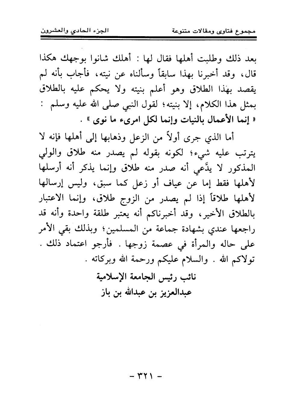 بعد ذلك وطلبت أهلها فقال لها: أهلك شانوا بوجهك، هكذا قال، وقد أخبرنا بهذا سابقا وسألناه عن نيته، فأجاب بأنه لم يقصد بهذا الطلاق، وهو أعلم بنيته ولا يحكم عليه بالطلاق بمثل هذا الكلام، إلا بنيته؛ لقول النبي - صلى الله عليه وسلم -: «إنما الأعمال بالنيات، وإنما لكل امرئ ما نوى (¬1) » .