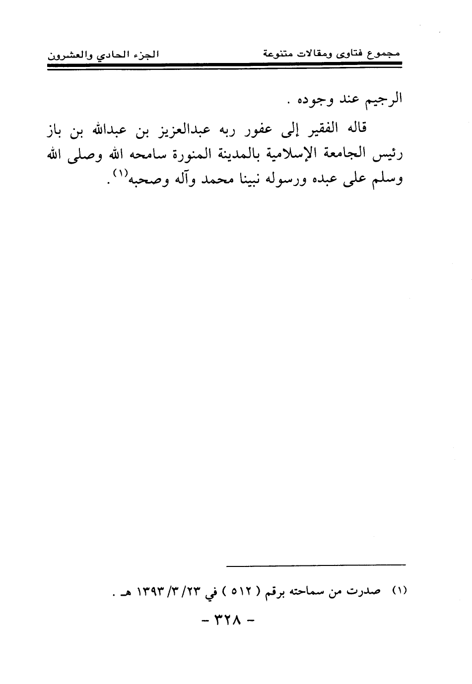 قاله الفقير إلى غفور ربه عبد العزيز بن عبد الله بن باز رئيس الجامعة الإسلامية بالمدينة المنورة، سامحه الله، وصلى الله وسلم على عبده ورسوله نبينا محمد وآله وصحبه (¬1) .