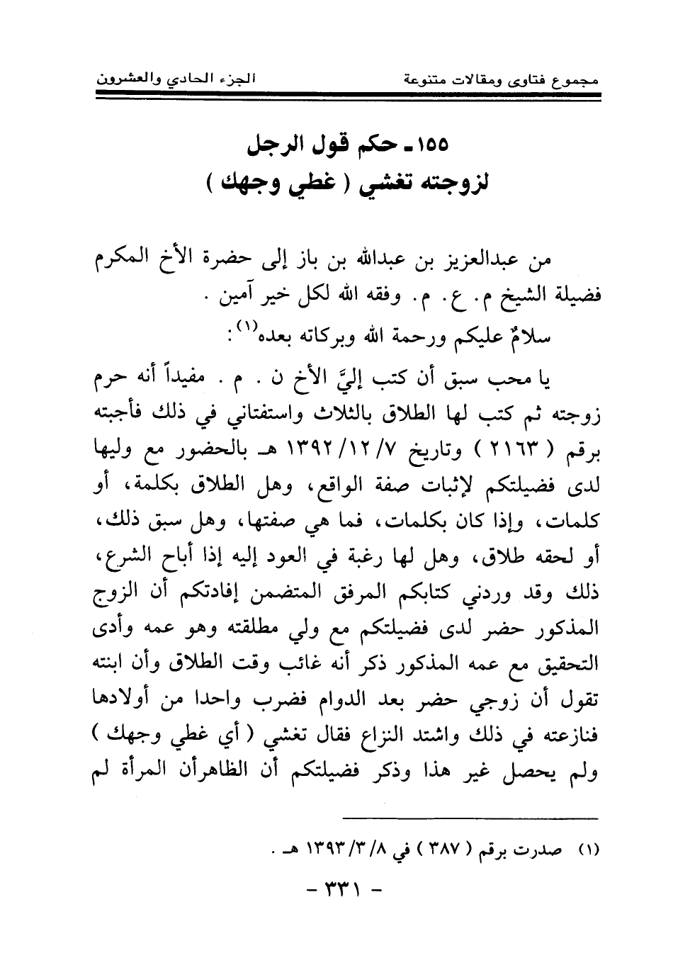 يا محب سبق أن كتب إلي الأخ ن. م. مفيدا أنه حرم زوجته ثم كتب لها الطلاق بالثلاث، واستفتاني في ذلك فأجبته (2163) وتاريخ 7\12\1392هـ بالحضور مع وليها لدى فضيلتكم لإثبات صفة الواقع، وهل الطلاق بكلمة، أو كلمات، وإذا كان بكلمات، فيما هي صفتها، وهل سبق ذلك، أو لحقه طلاق، وهل لها رغبة في العود إليه إذا أباح الشرع، ذلك وقد وردني كتابكم المرفق المتضمن إفادتكم أن الزوج المذكور حضر لدى فضيلتكم مع ولي مطلقته وهو عمه وأدى التحقيق مع عمه المذكور ذكر أنه غاب وقت الطلاق وأن ابنته تقول: إن زوجي حضر بعد الدوام فضرب واحدا من أولادها فنازعته في ذلك واشتد النزاع، فقال تغشي (أي غطي وجهك) ولم يحصل غير هذا، وذكر فضيلتكم أن الظاهر أن المرأة لم
