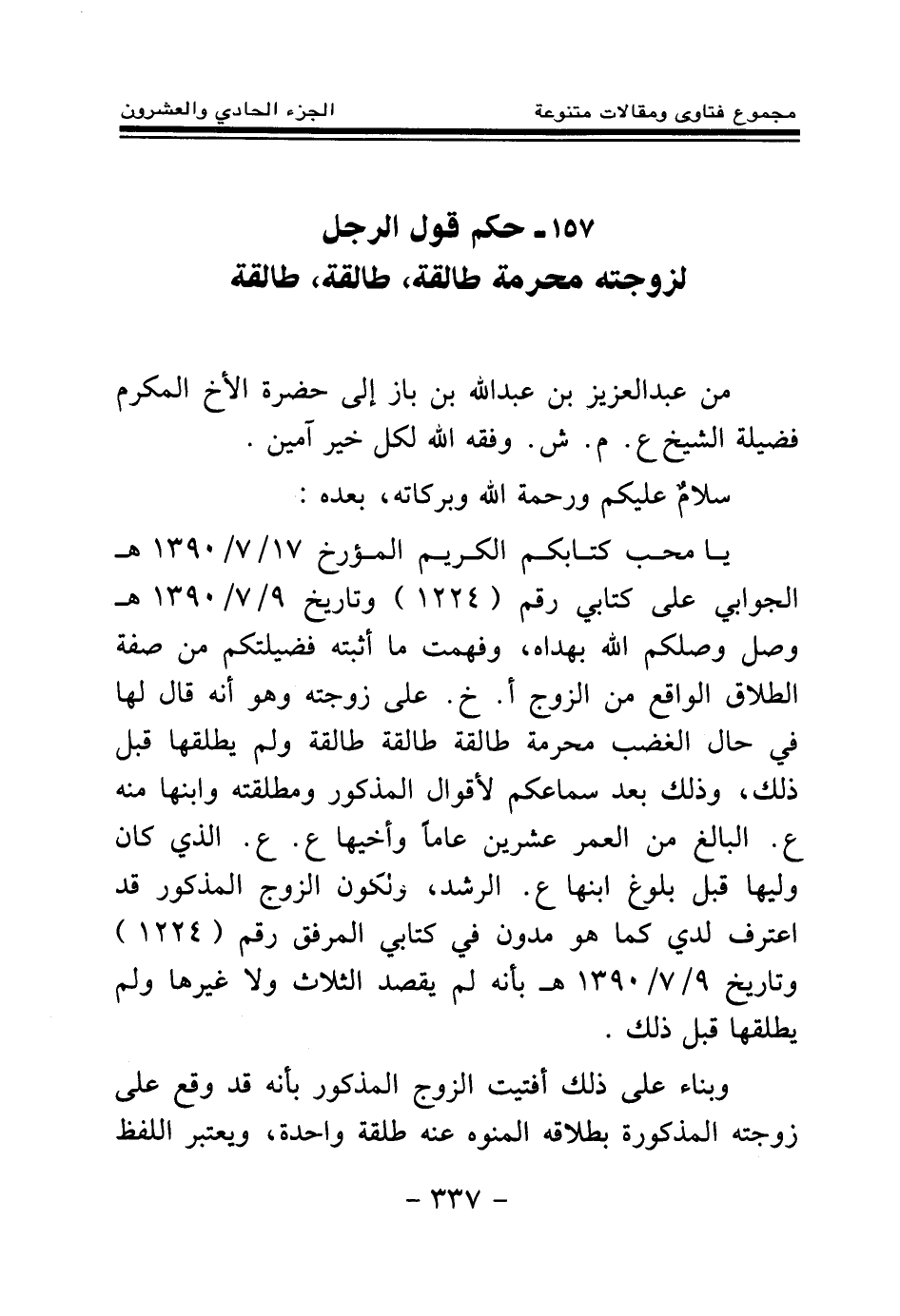 يا محب كتابكم الكريم المؤرخ 17\7\1390هـ الجوابي على كتابي رقم (1224) وتاريخ 9\7\1390هـ وصل وصلكم الله بهداه، وفهمت ما أثبته فضيلتكم من صفة الطلاق الواقع من الزوج أ. خ. على زوجته، وهو أنه قال لها في حال الغضب محرمة طالقة طالقة طالقة، ولم يطلقها قبل ذلك، وذلك بعد سماعكم لأقوال المذكور ومطلقته وابنها منه ع. البالغ من العمر عشرين عاما، وأخيها ع. ع. الذي كان وليها قبل بلوغ ابنها ع. الرشد، ولكون الزوج المذكور قد اعترف لدي كما هو مدون في كتابي المرفق رقم (1224) وتاريخ 9\7\1390هـ بأنه لم يقصد الثلاث ولا غيرها، ولم يطلقها قبل ذلك.