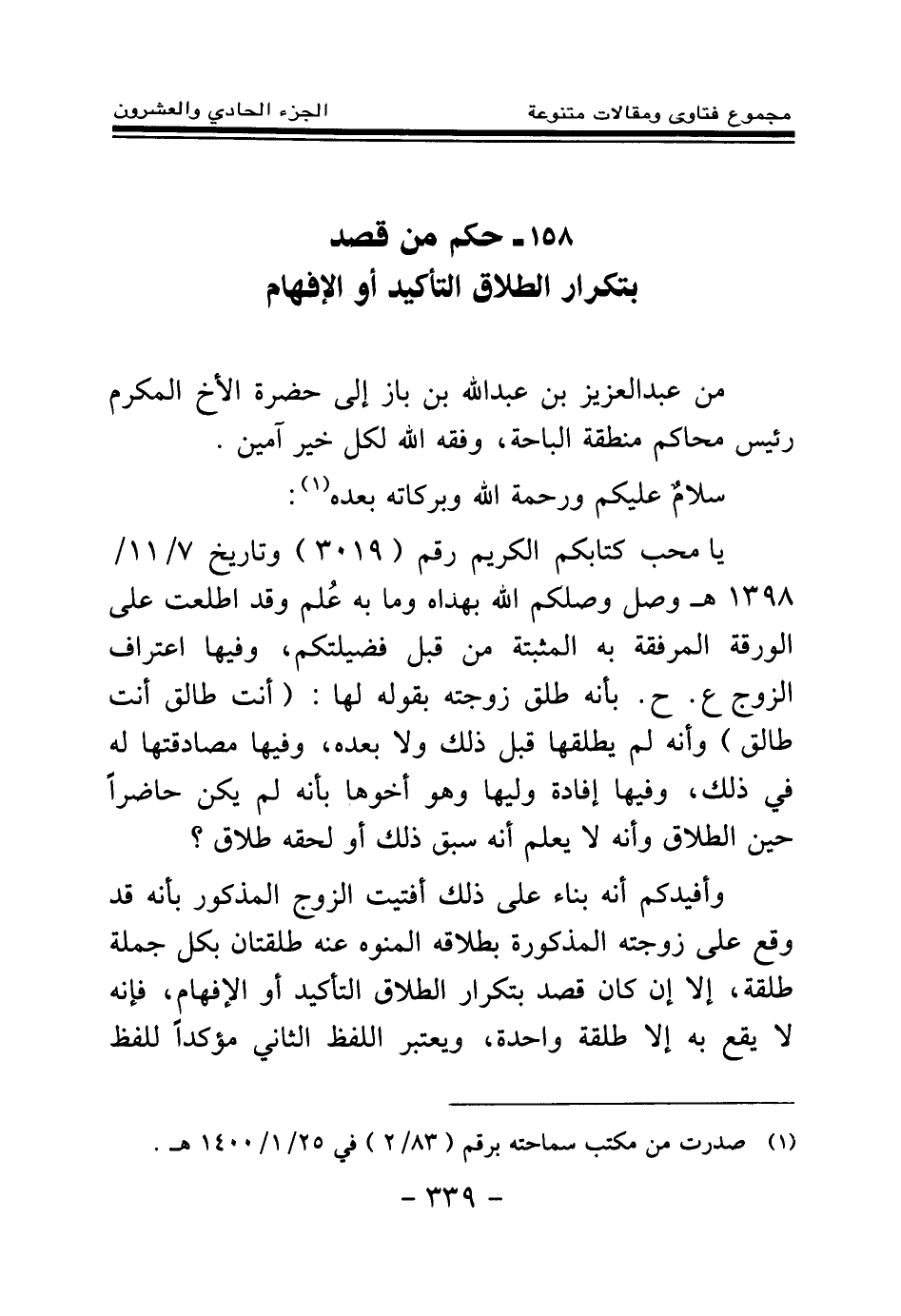 من عبد العزيز بن عبد الله بن باز إلى حضرة الأخ المكرم رئيس محاكم منطقة الباحة، وفقه الله لكل خير، آمين.