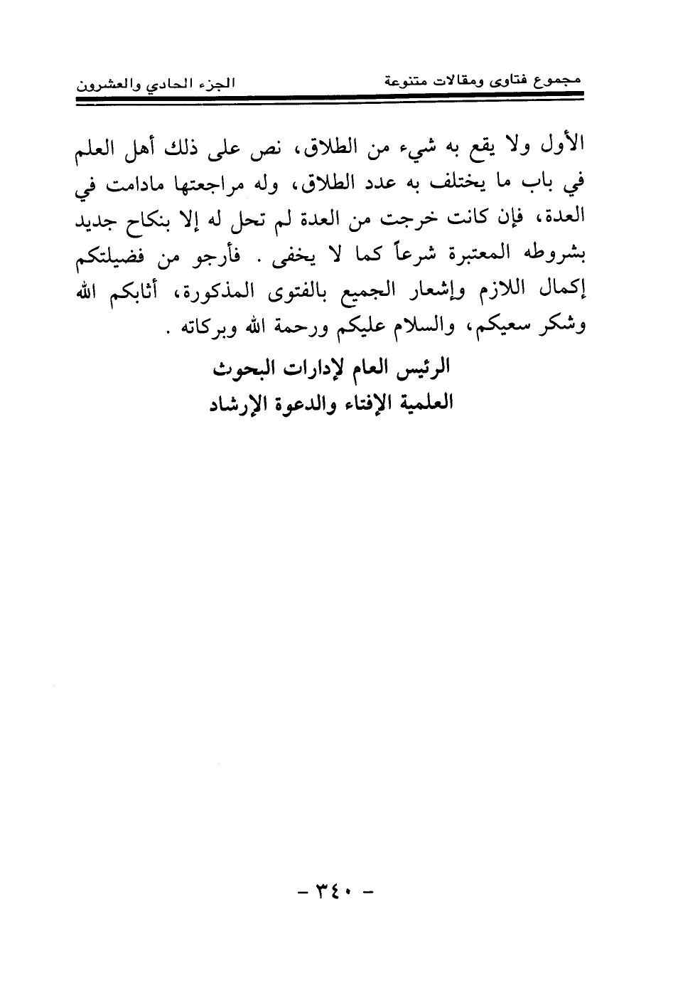 الأول ولا يقع به شيء من الطلاق، نص على ذلك أهل العلم في باب ما يختلف به عدد الطلاق، وله مراجعتها ما دامت في العدة، فإن كانت خرجت من العدة لم تحل له إلا بنكاح جديد بشروطه المعتبرة شرعا كما لا يخفى. فأرجو من فضيلتكم إكمال اللازم وإشعار الجميع بالفتوى المذكورة، أثابكم الله وشكر سعيكم، والسلام عليكم ورحمة الله وبركاته.