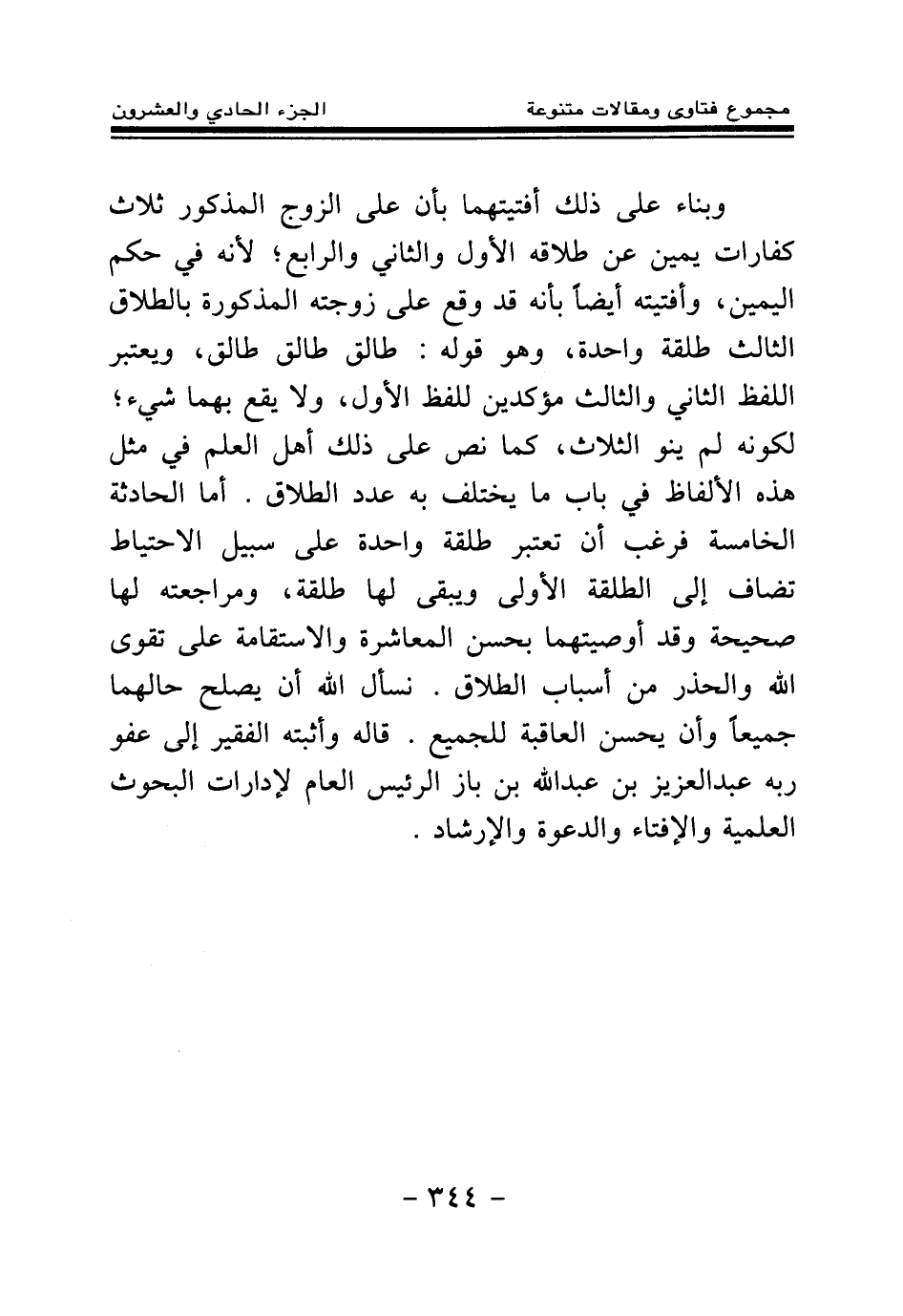 وبناء على ذلك أفتيتهما بأن على الزوج المذكور ثلاث كفارات يمين عن طلاقه الأول والثاني والرابع؛ لأنه في حكم اليمين، وأفتيته أيضا بأنه قد وقع على زوجته المذكورة بالطلاق الثالث طلقة واحدة، وهو قوله: طالق، طالق، طالق، ويعتبر اللفظ الثاني والثالث مؤكدين للفظ الأول، ولا يقع بهما شيء؛ لكونه لم ينو الثلاث، كما نص على ذلك أهل العلم في مثل هذه الألفاظ في باب ما يختلف به عدد الطلاق. أما الحادثة الخامسة فرغب أن تعتبر طلقة واحدة على سبيل الاحتياط تضاف إلى الطلقة الأولى، ويبقى لها طلقة، ومراجعته لها صحيحة، وقد أوصيتهما بحسن المعاشرة والاستقامة على تقوى الله والحذر من أسباب الطلاق. نسأل الله أن يصلح حالهما جميعا، وأن يحسن العاقبة للجميع. قاله وأثبته الفقير إلى عفو ربه عبد العزيز بن عبد الله بن باز الرئيس العام لإدارات البحوث العلمية والإفتاء والدعوة والإرشاد