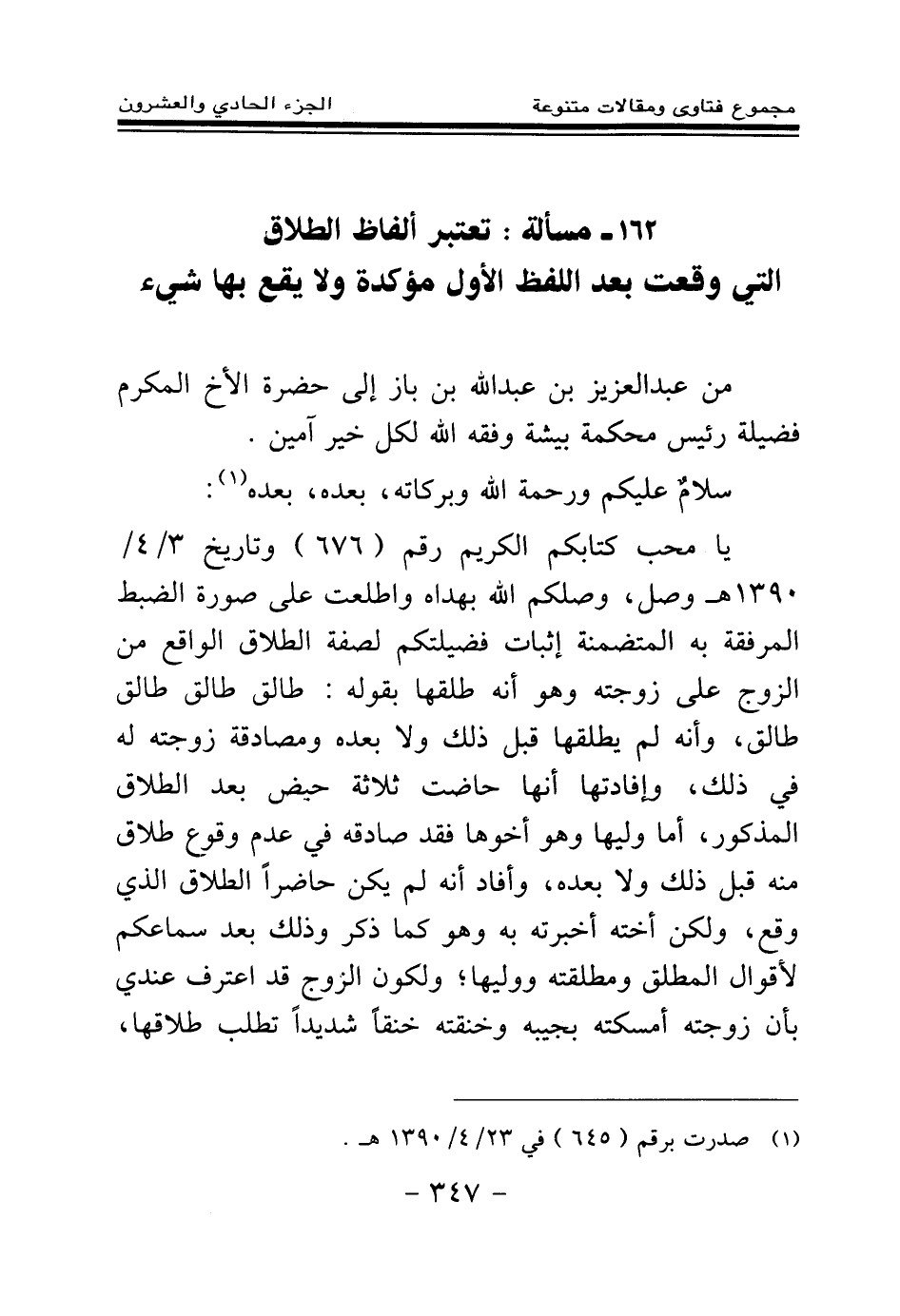162 - مسألة: تعتبر ألفاظ الطلاق التي وقعت بعد اللفظ الأول مؤكدة ولا يقع بها شيء