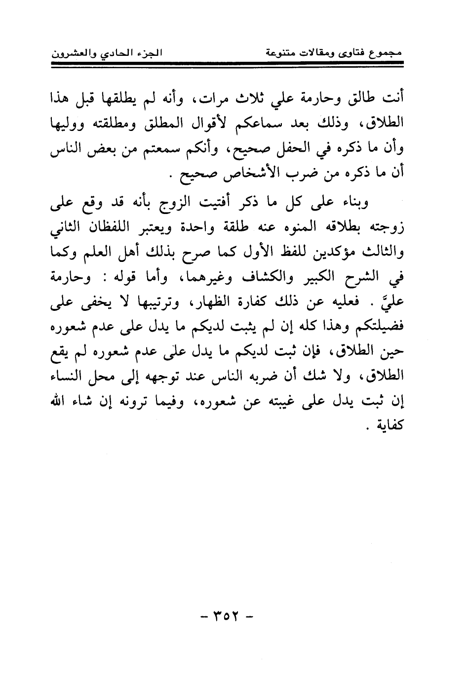 وبناء على كل ما ذكر أفتيت الزوج بأنه قد وقع على زوجته بطلاقه المنوه عنه طلقة واحدة، ويعتبر اللفظان الثاني والثالث مؤكدين للفظ الأول كما صرح بذلك أهل العلم، وكما في الشرح الكبير والكشاف وغيرهما، وأما قوله: وحارمة علي. فعليه عن ذلك كفارة الظهار، وترتيبها لا يخفى على فضيلتكم، وهذا كله إن لم يثبت لديكم ما يدل على عدم شعور. حين الطلاق، فإن ثبت لديكم ما يدل على عدم شعوره لم يقع الطلاق، ولا شك أن ضربه الناس عند توجهه إلى محل النساء إن ثبت يدل على غيبته عن شعوره، وفيما ترونه إن شاء الله كفاية.